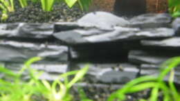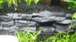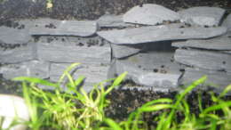 Die Schieferterrasse bildet einen schönen Blickfang, dahinter ist eine Höhle aus Schiefersteinen im Bodengrund. So hoffe ich für die Welse und Dornaugen eine gute Versteckmöglichkeit geschaffen zu haben.