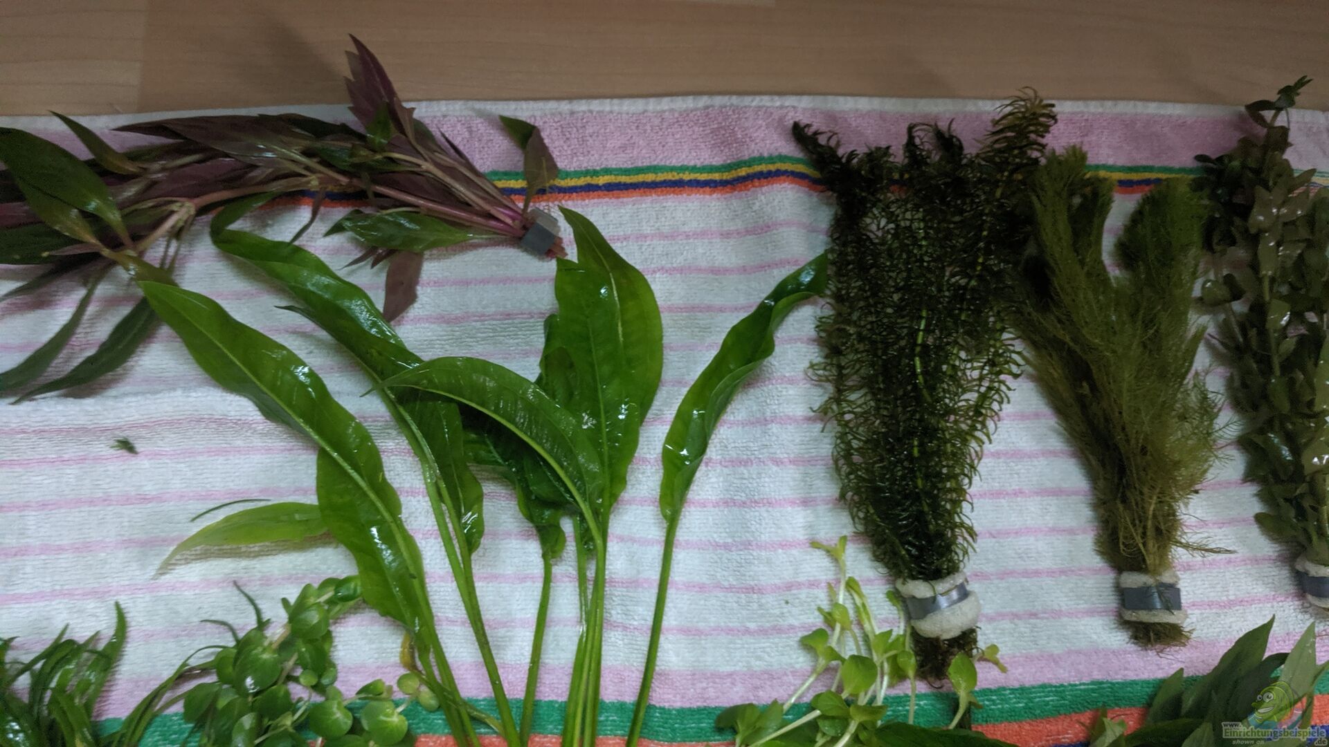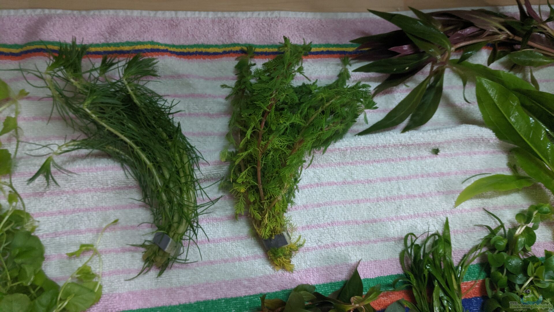 Gestern sind die Pflanzen eingetroffen und ich war ziemlich begeistert - für 30??? so viele Wasserpflanzen! Bilder dazu werden gleich angefügt ^^ Leider konnte ich nicht alle Pflanzen bestimmen, es kamen keine Bezeichnungen für sie an, falls ihr wisst was das für Pflanzen sind, scheibt es mir gerne, oder korrigiert mich falls ich was falsch bestimmt habe. Heute habe ich auch eine Bio Co² Mischung angesetzt, 120g Zucker, 300ml Wasser sowie ein wenig Frischbackhefe. Wenn das mit dem Co² und dem Pflanzenwachstum gut klappen sollte, werde ich mir mal die ``Mühe´´ machen und einen Tortenguss Ansatz herstellen, das soll ja stabiler und gleichmä??iger laufen. Eine Kokosnusshöhle hab ich rausgenommen, sie sah dort einfach nicht gut aus und hat auch zu viel Platz eingenommen, mein geplanter Besatz würde solche Höhlen eh nur bedingt benutzen. Vielleicht stelle ich auch einfach eine Frage im Forum, was die Pflanzen angeht.