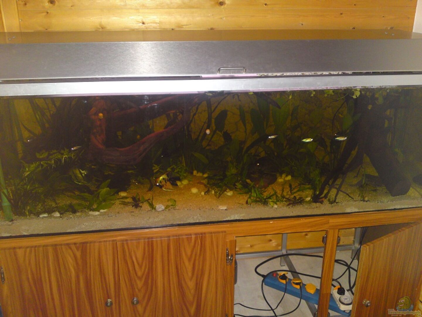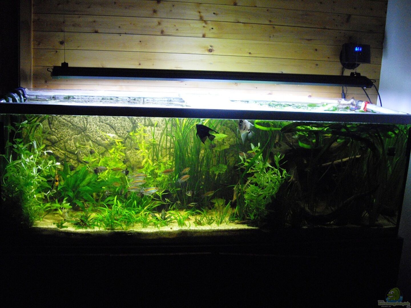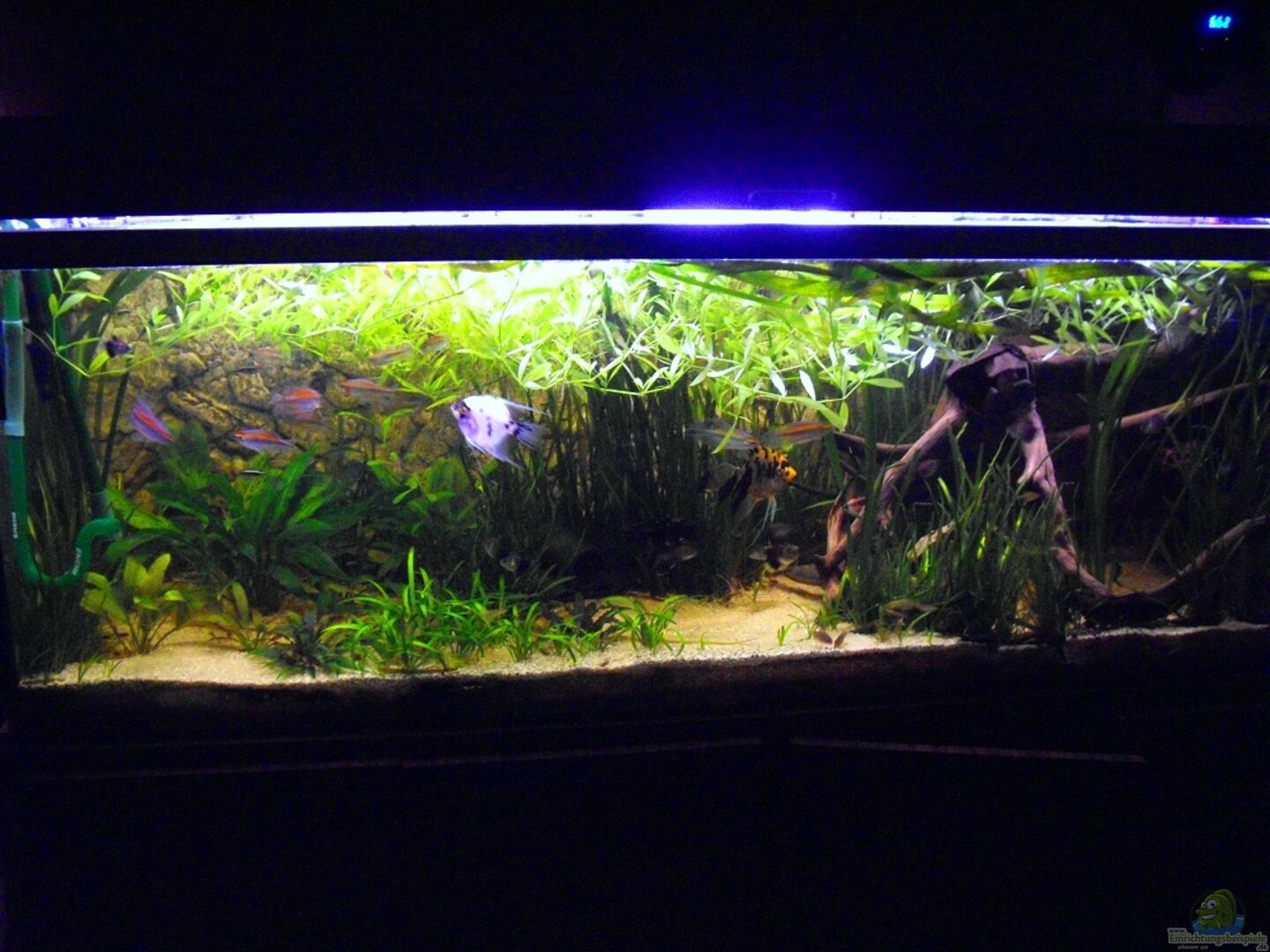 Das Aquarium ist in eine dunkle "Wurzelecke" und in eine "Pflanzenecke" eingeteilt, damit sowohl Verstecke für die Welse, als auch freier Schwimmraum für die Skalare und Salmler vorhanden sind.