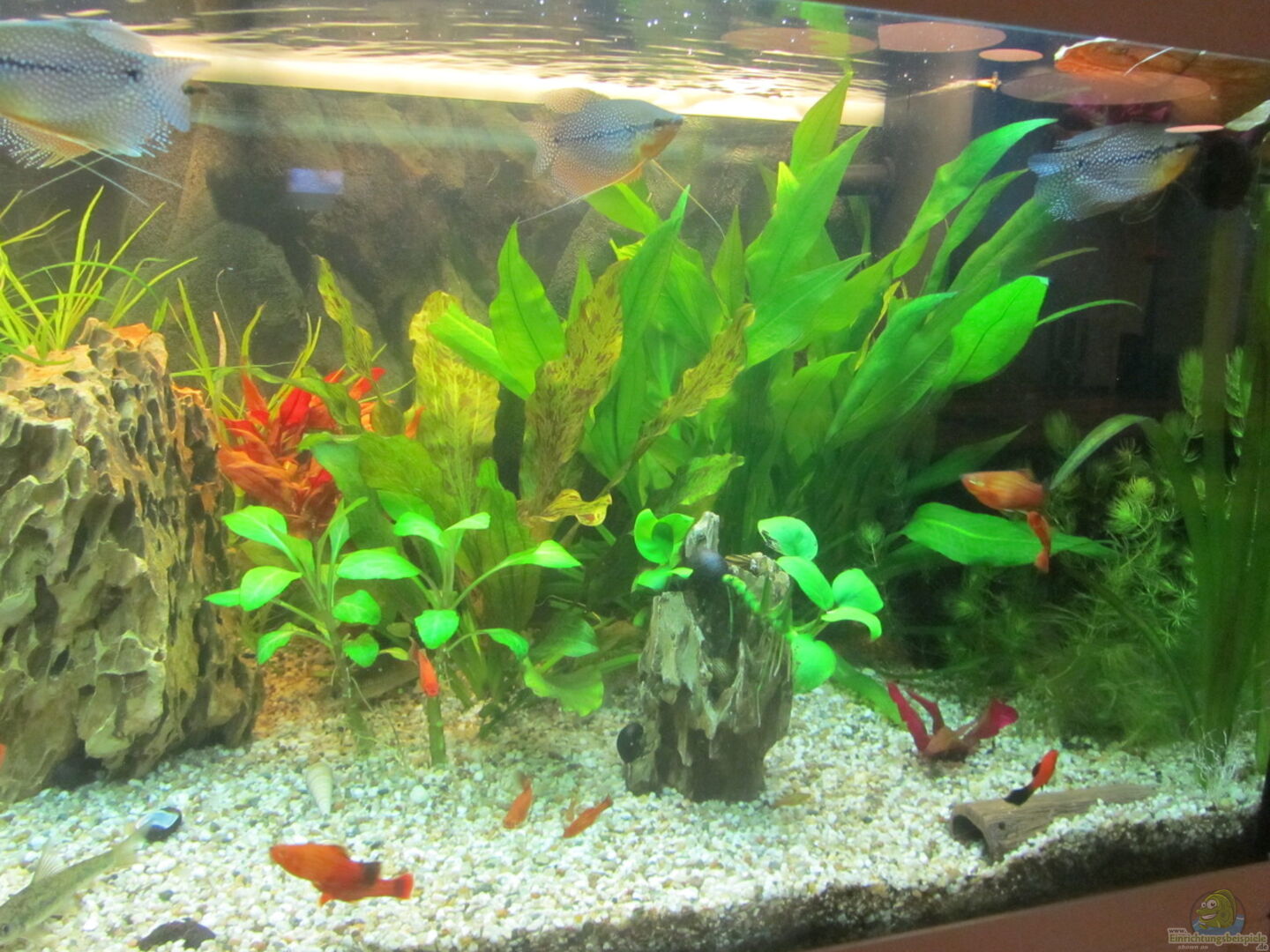 Gesellschaftsbecken waren noch vor ein paar Jahren der Standard und nur ganz wenige über Biotopbecken überhaupt bekannt. Inzwischen hat sich das geändert und auch oder gerade im Gesellschaftsbecken sollte darauf geachtet werden, allen Ansprüchen aller Tiere gerecht zu werden. Das ist dir auch weitesgehend gelungen. Bei so ausgesprochenen Weichwasserfischen wie dem Blauen Neon bin ich mir aber nicht sicher, ob es klug ist, den mit Platys zu vergesellschaften.
