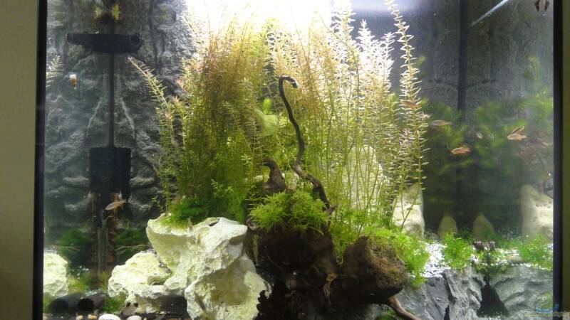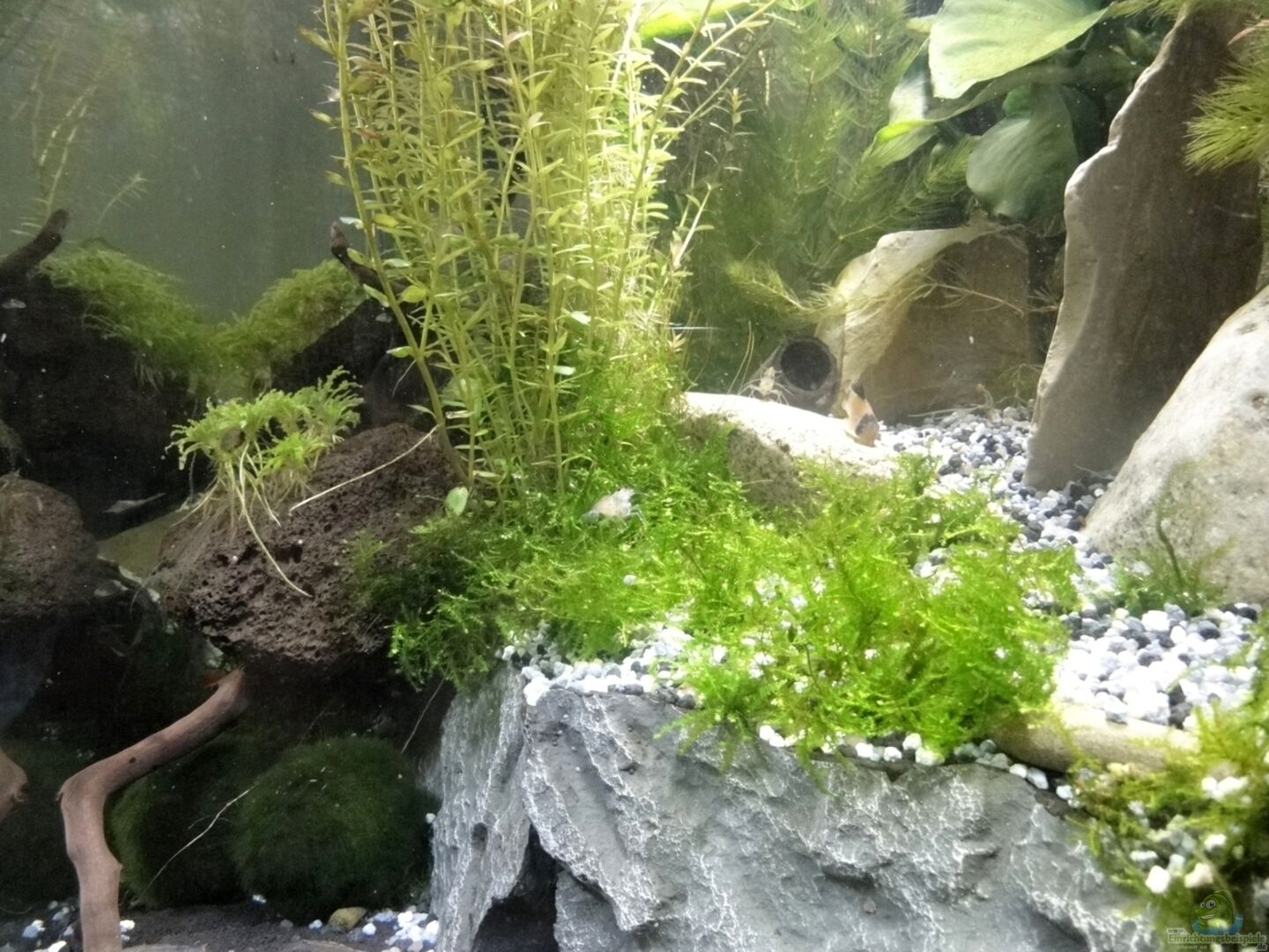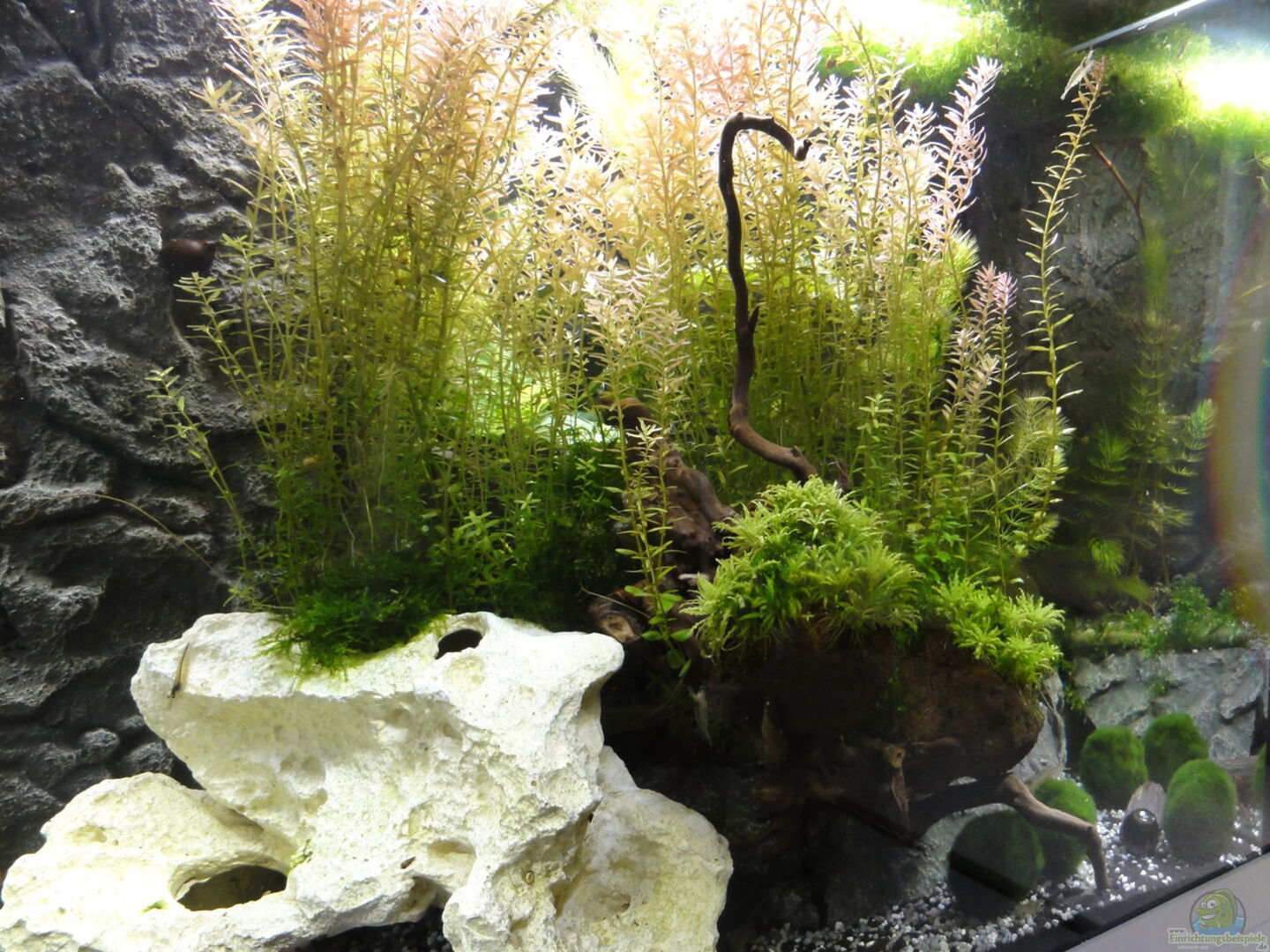 Javamoos (Taxiphyllum barbieri) wurde an verschiedenen Stellen befestigt (und von den Garnelen mit Vergnügen wieder ent-festigt)