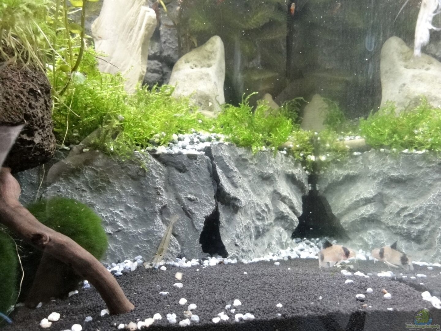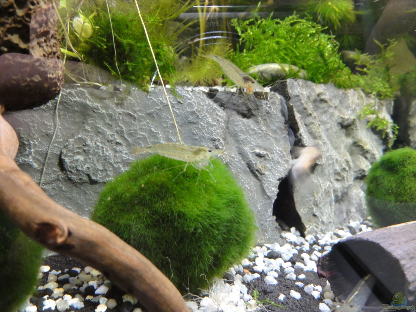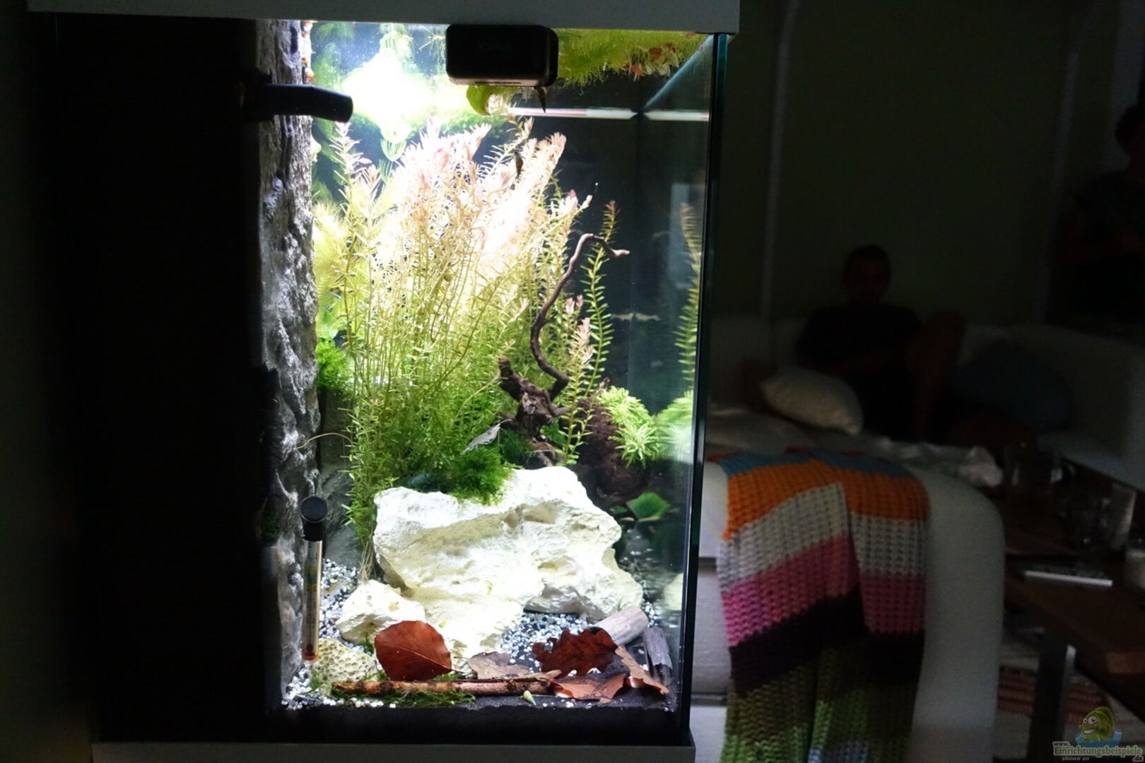 Das Becken folgt keinem bestimmten Thema oder versucht eine bestimmte Region möglichst realistisch nachzubilden, Hauptaufgabe war es vielmehr, den Garnelis alles zu bieten was sie happy macht - möglichst viele Versteckmöglichkeiten, Höhlen, feinen Sand, Moos, und feinfiedrige Pflanzen.