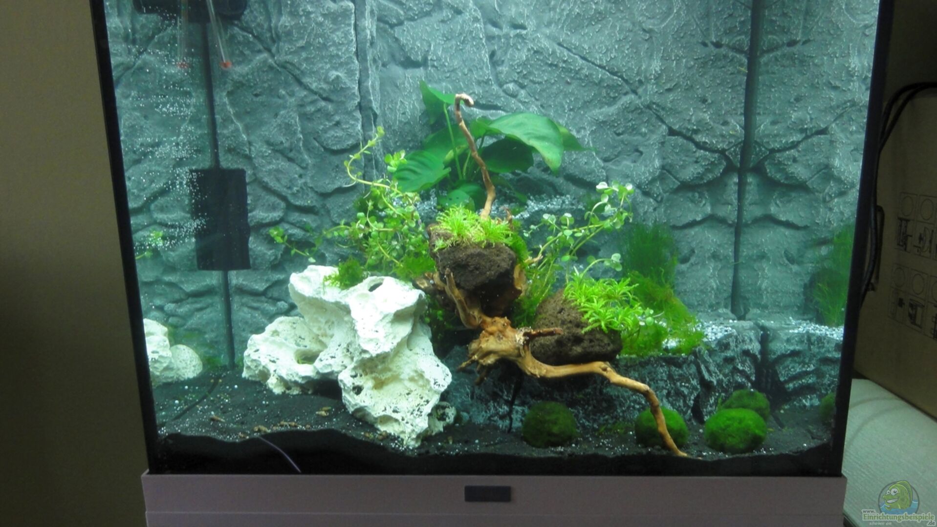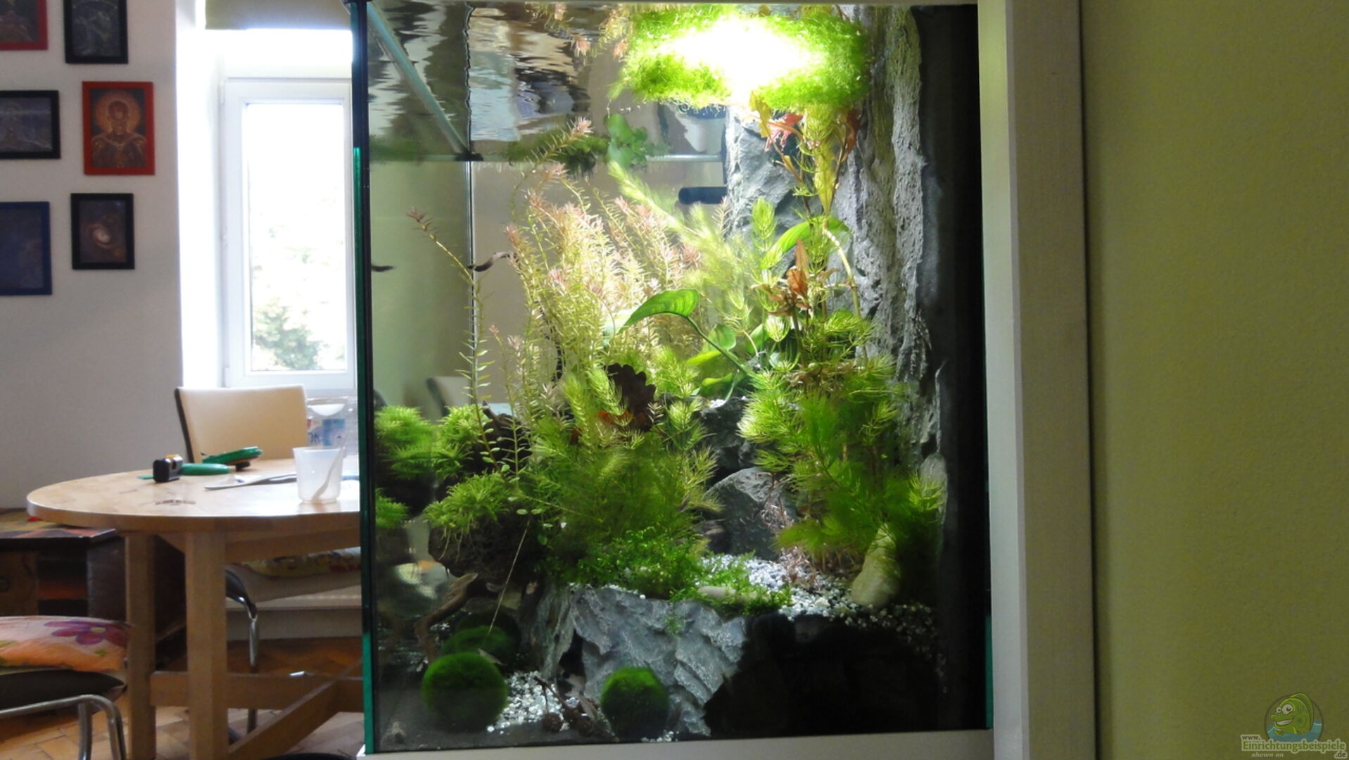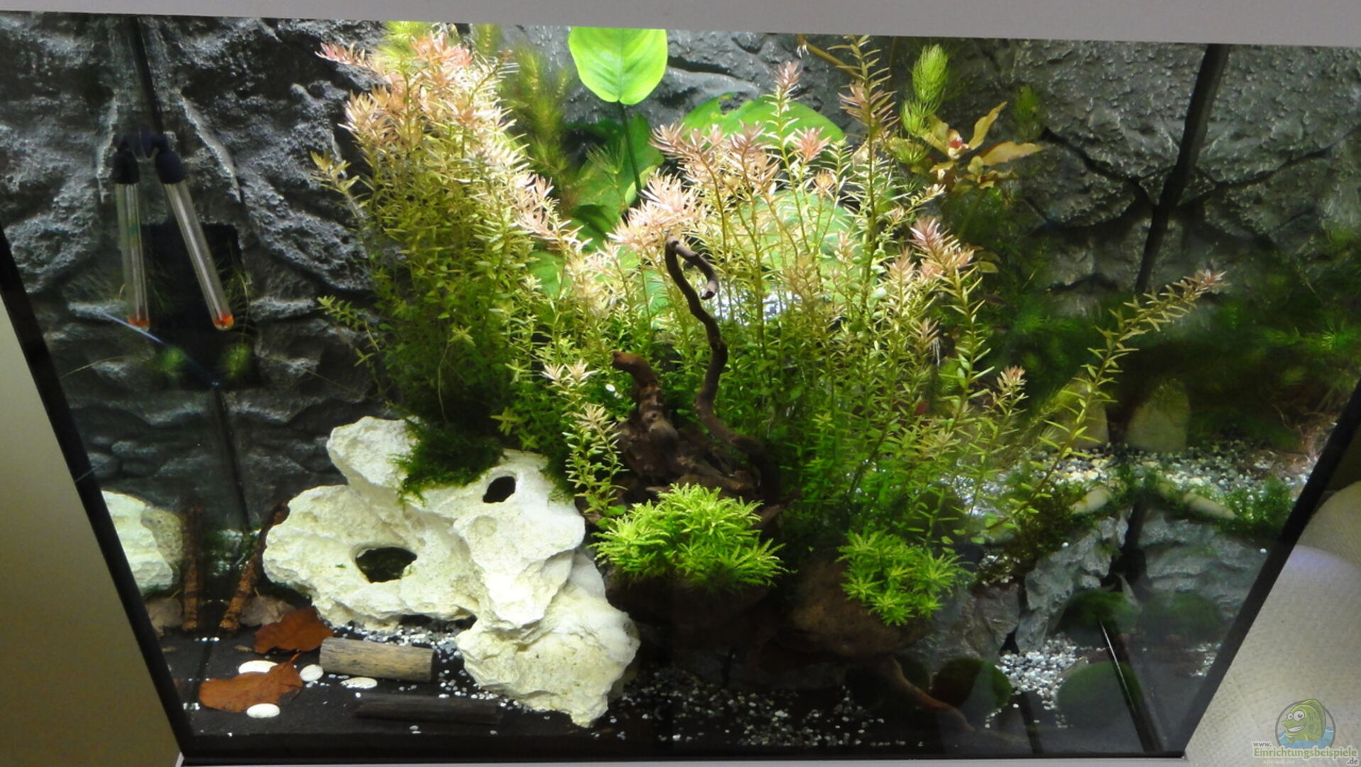 Das Becken folgt keinem bestimmten Thema oder versucht eine bestimmte Region möglichst realistisch nachzubilden, Hauptaufgabe war es vielmehr, den Garnelis alles zu bieten was sie happy macht - möglichst viele Versteckmöglichkeiten, Höhlen, feinen Sand, Moos, und feinfiedrige Pflanzen.