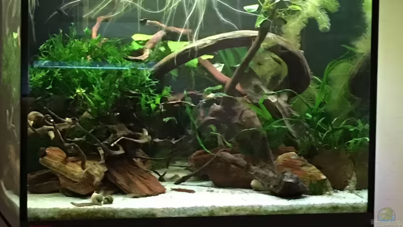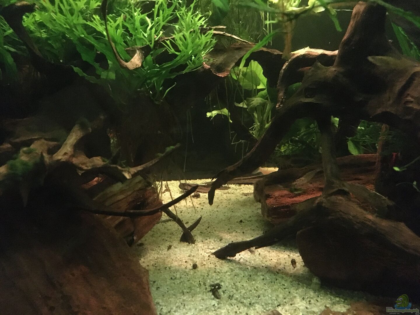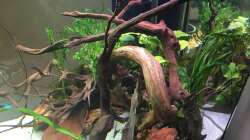 Hier wurden auch die Wurzeln des Vorgängeraquariums verwendet, Moorkienholz und Fingerwurzeln.Desweiteren habe ich noch ca.10 Steine eingebracht, es handelt sich hierbei um versteinetes Laub.