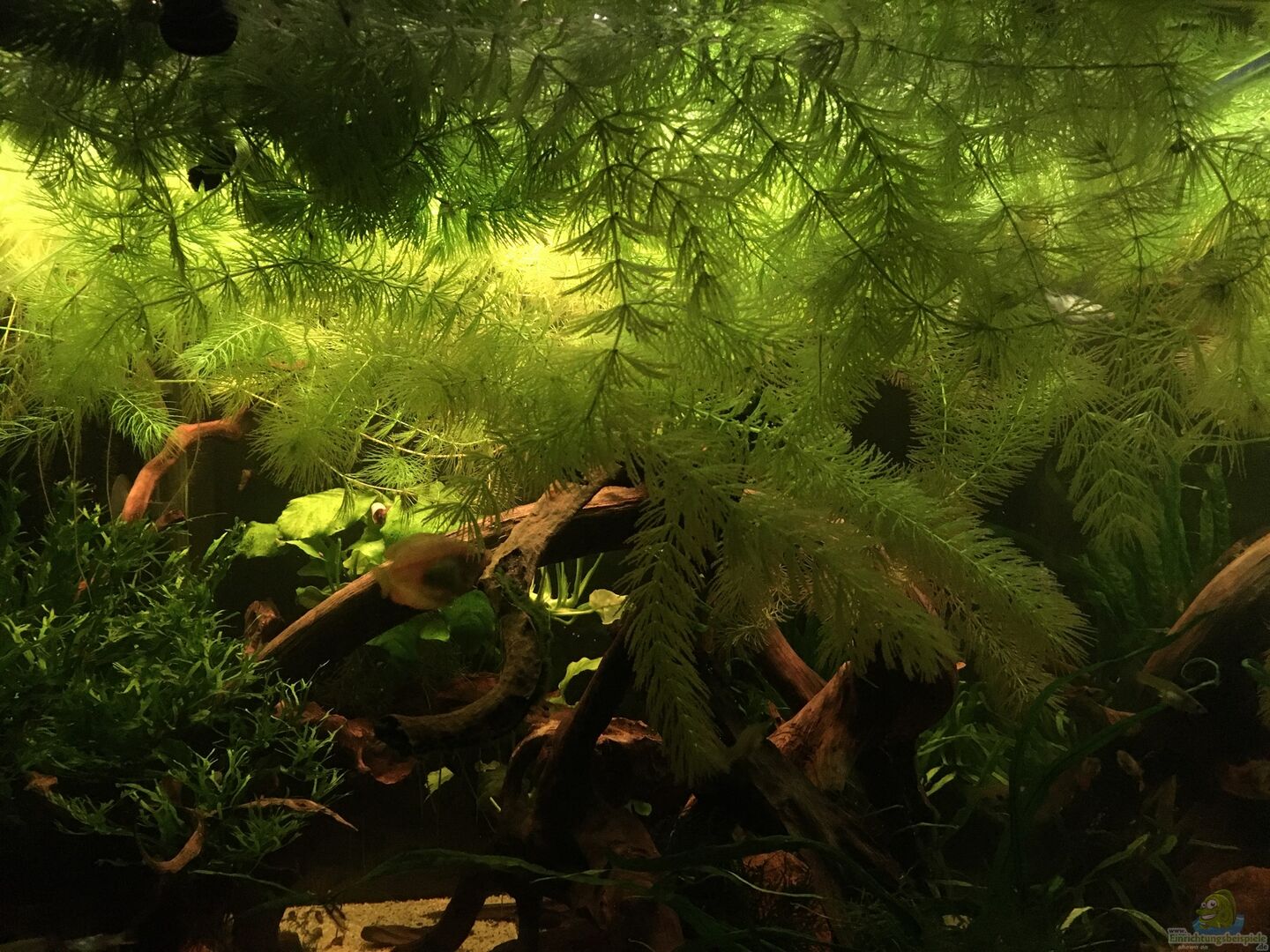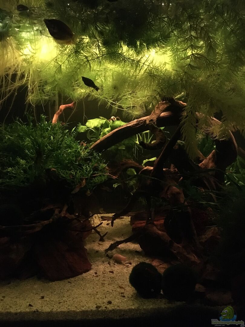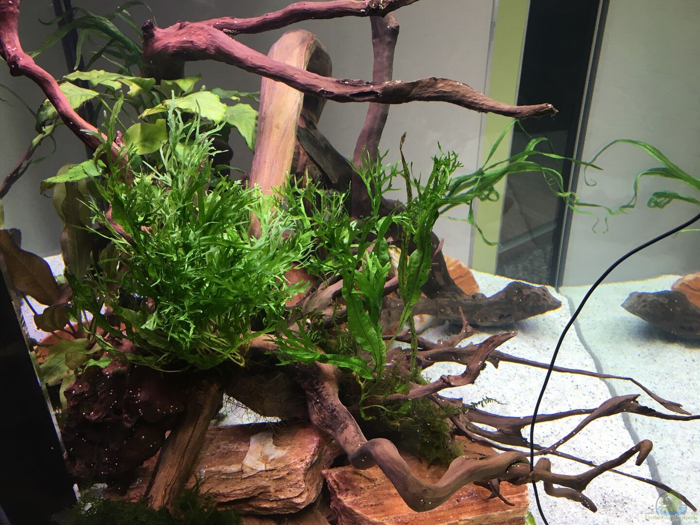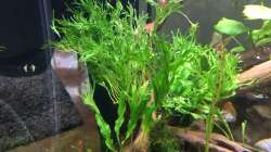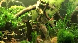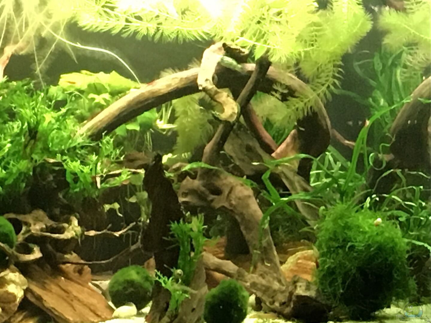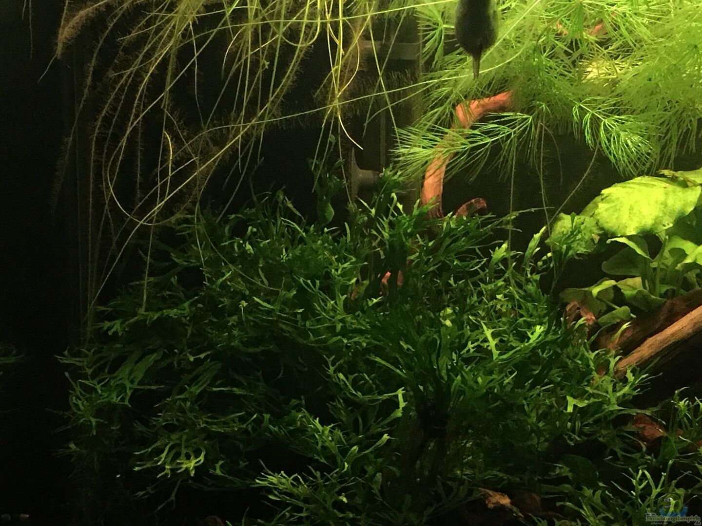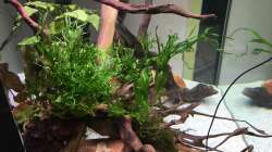 Hier habe ich mich für Moose und Aufsitzerpflanzen entschieden, Ausnahme, eine Amazonas Schwertpflanze.Das Becken ist mit Windelov-Javafarn, Needle Leaf Javafarn, Spikymoos, Christmasmoos und Javamoos bepflanzt. Es sind zwei weitere Sorten dazu gekommen, der kleinohrige Büschelfarn und der südamerikanische Froschbiss, beides Schwimmpflanzen.3 sogenannte Moosbälle, eigentlich eine Algenart die fast überall auf der Welt im Sü?? und Brackwasser vorkommt.