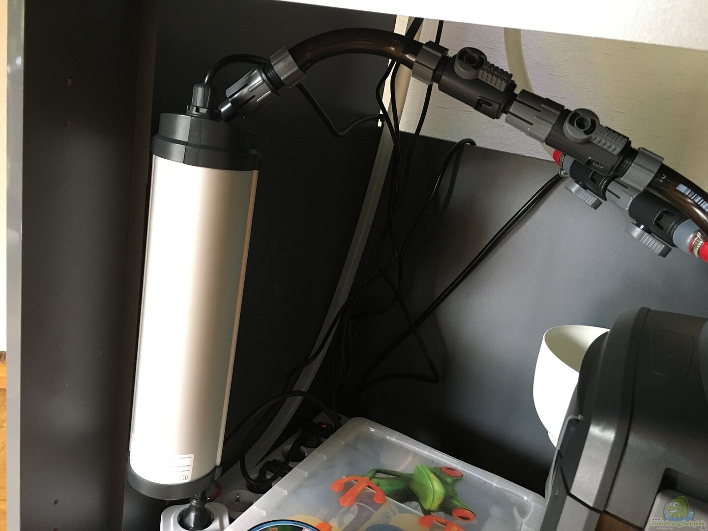 Am Filter habe ich an der Rückführung zum Aquarium einen Eheim UV-C 800 hängen, da scheiden sich ja die Geister, ich hatte den auch schon an meinem 450 Liter Becken und konnte nie Nachteile erkennen.Vorteile?Auch nicht wirklich, muss aber sagen das ich nie irgend welche Probleme mit Krankheiten bei meinen Fischen hatte. Der UV-C Klärer wird mittlerweile nicht mehr am Aquarium betrieben, Grund, im Unterschrank des Eheim Incpiria ist einfach nicht genug Platz, Nachteile kann ich keine feststellen.