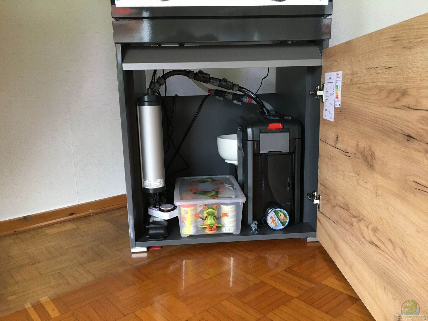 Das Aquarium wird mit dem Eheim Au??enfilter Professional4+ 600 gefiltert, ich habe dort zwei Körbe mit Siporax befüllt und somit das ursprüngliche Filtermaterial das Eheim serienmä??ig mitliefert aus zwei Körben ausgetauscht.Ich hatte vor diesem Filter 2 JBL Greenline, auch in Ordnung aber für mich ist Eheim in der Filterung einfach das Nonplusultra.