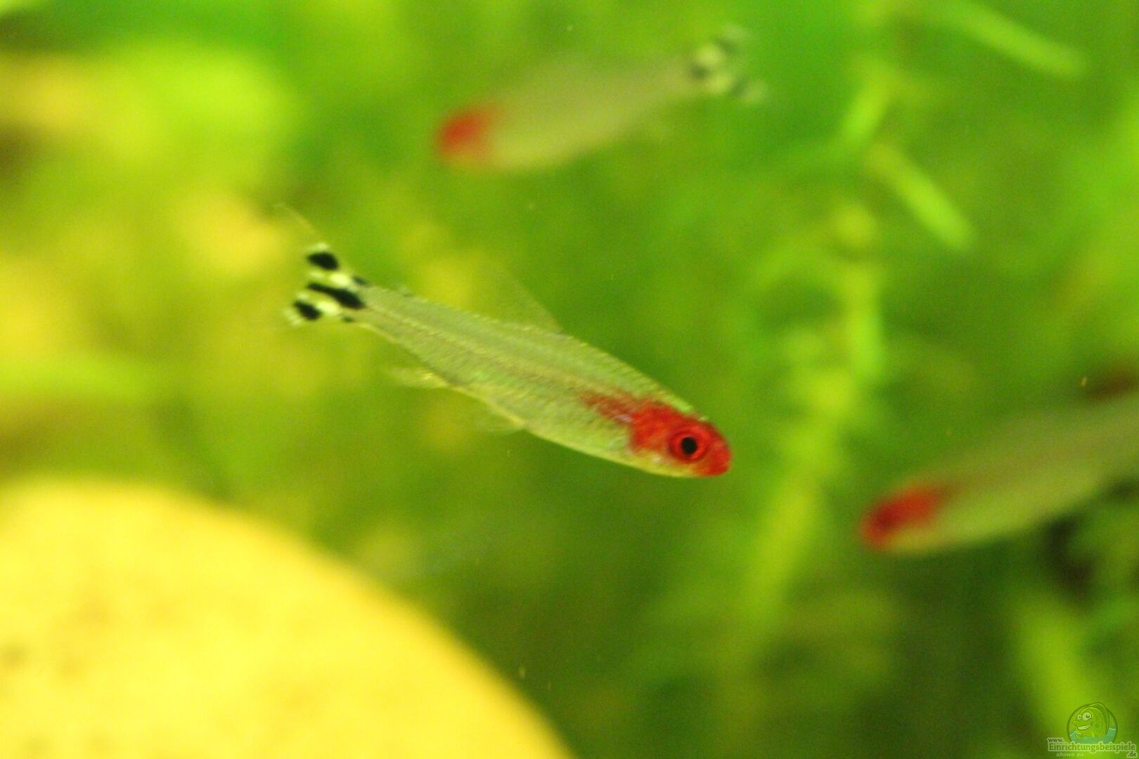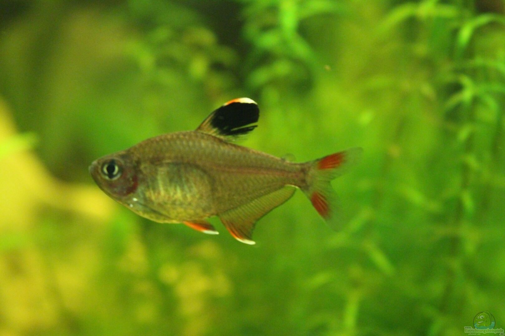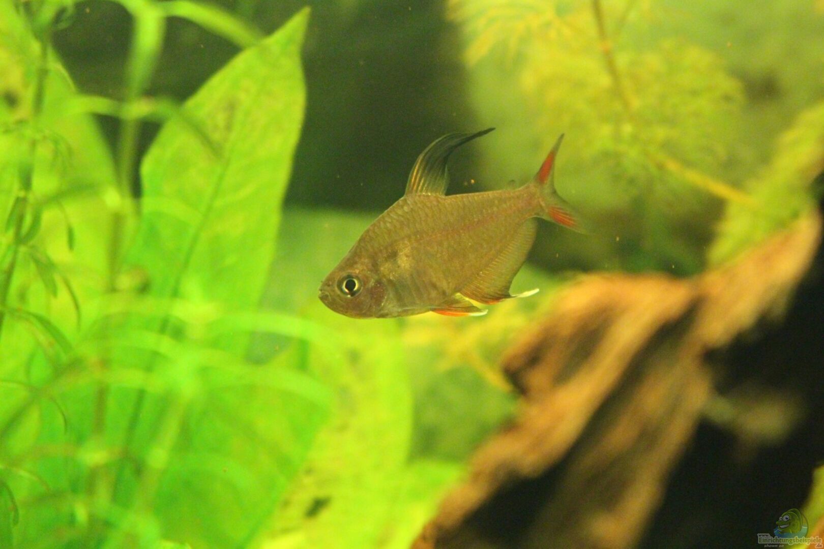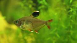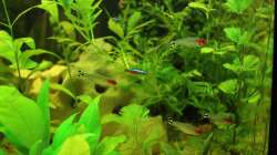 3 blaue Antenenwelse, 8 rote Neons, 5 Rotkopfsalmler, 6 Schmucksalmler , 1 Zwergfadenfischpaar , 2 Netzschmerle und ein paar kleine eingeschleppte Schnecken :-) (werden aber reduziert)