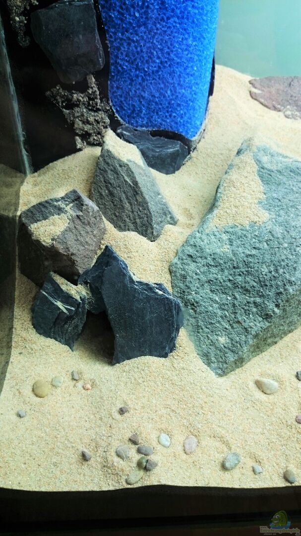 Den Sand lass ich nach hinten hin aufsteigen. Dazu kommen noch 1-2 Hände kleine Kieselsteine aus dem örtlichen Bach um einen schönen MischMasch zu erhalten.