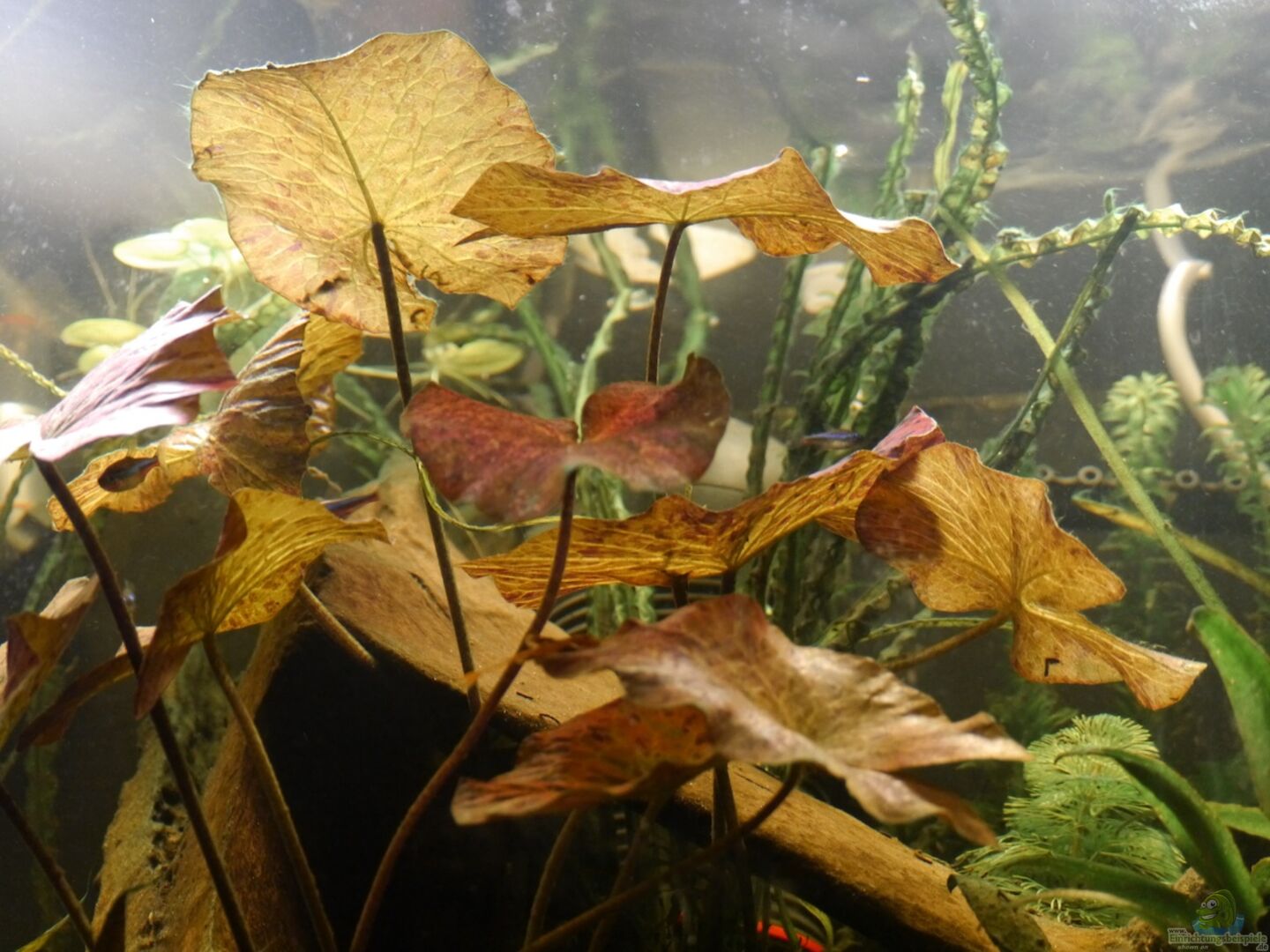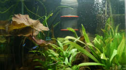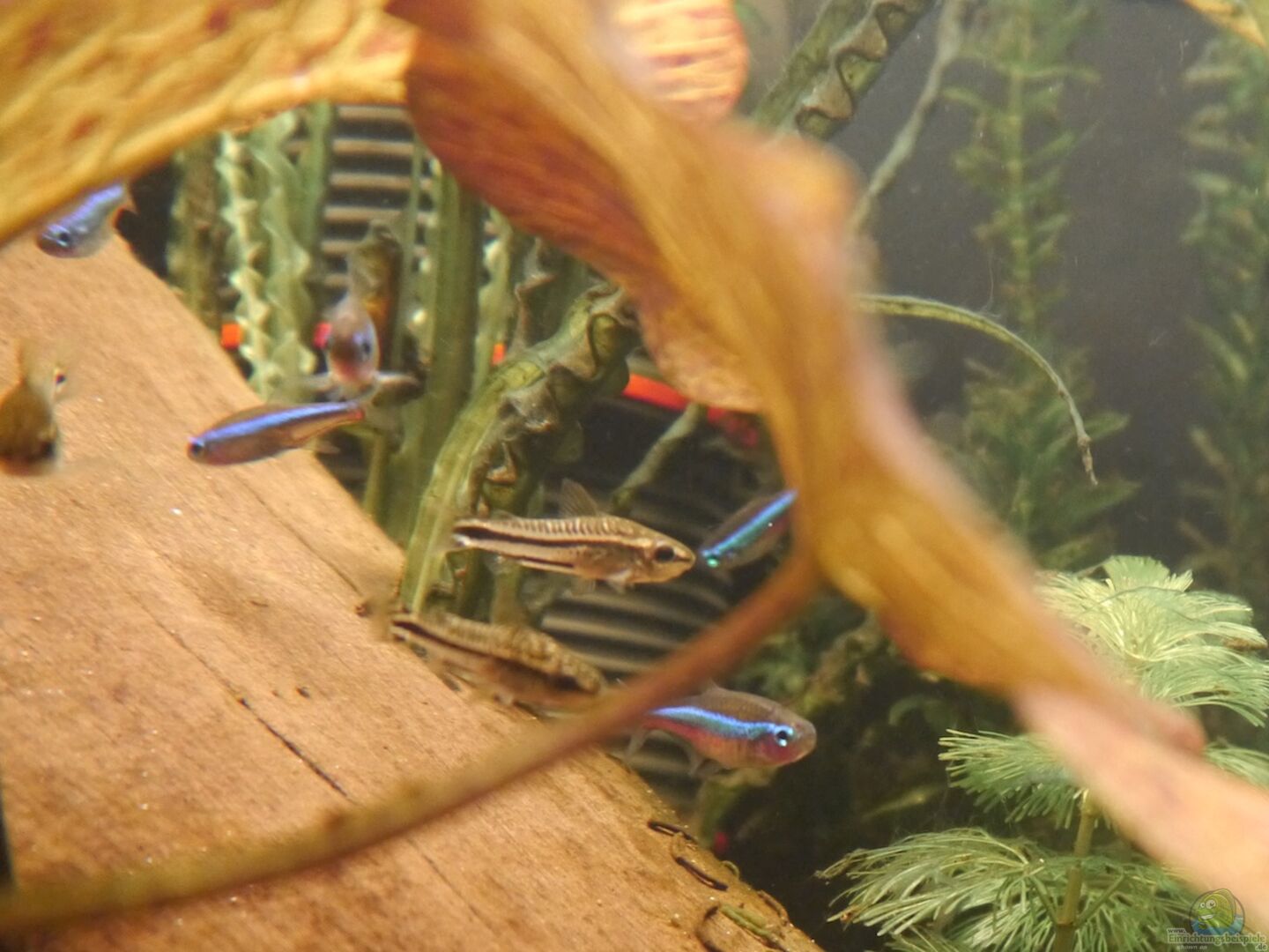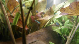 Meine 8 Blauen Neons kann ich oft dabei beobachten, wie sie im oberen Drittel im Schutz des Lotus und der Schwimmpflanzen umherschwimmen. Sie sind recht neugierig und gern in Bewegung, machen aber auch hin und wieder Pausen im Schatten der gro??en Holzwurzel. Bei ihren Streifzügen durch das Aquarium schlie??en sich der Gruppe oft ein paar Zwergpanzerwelse an, die von den Blauen Neons gern aufgenommen und integriert werden. Diese beiden Arten harmonieren bei mir sehr gut.