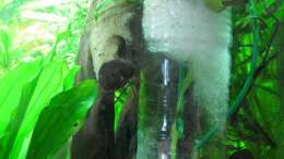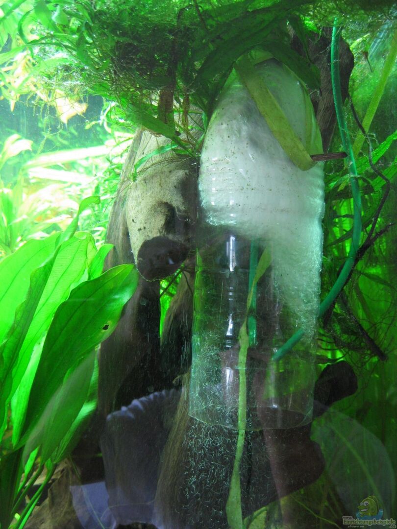 Die Belüftung mit Luft und bei Bedarf mit CO2 findet mit einer billigen selbstgebauten Konstruktion am Filterausgang statt. Um das Schlauchende vom Filterausgang ist eine unten aufgeschnittene Plastikflasche gebunden, in die Luft und CO2 gepumpt werden. Das gefilterte Wasser wird darin verwirbelt und die Gase komplett aufgelöst. Im Innern dieser Flasche herrscht die stärkste Strömung im Becken, und gelegentlich nutzen die Prachtschmerlen und auch die Welse diesen "Jet Stream" spielerisch für Schwimmübungen.