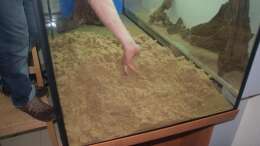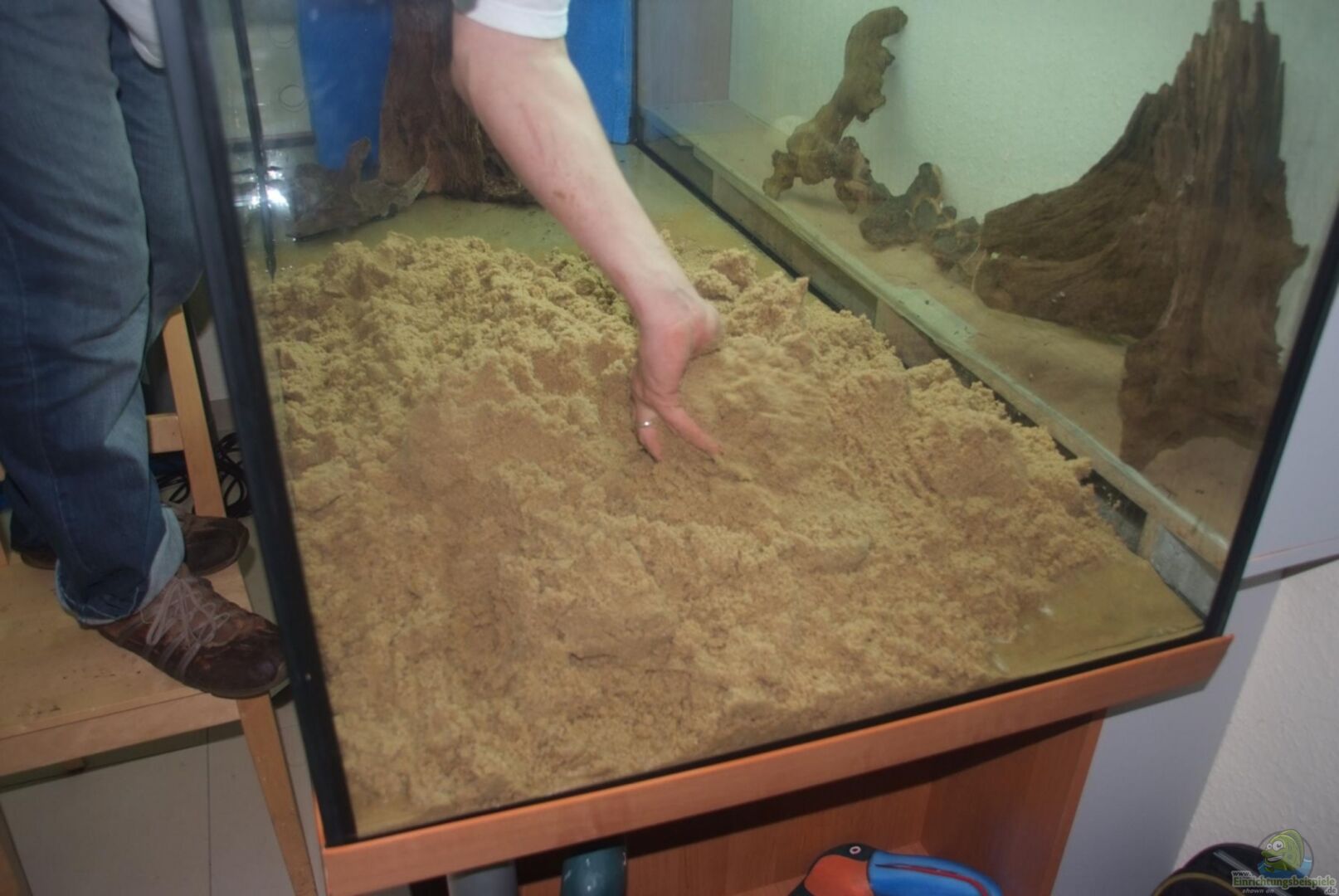 Der Bodengrund sind 150 Kilo heller kalkfreier Aquarienkies von 1-2 mm Körnung aus dem Baumarkt, und im Bereich vorne zum Gründeln eine feinere Körnung (Mittelsand) von 0, 3-0, 6mm. Das Ganze steigt von vorne 10cm auf ca. 20cm hinten an. Ich habe früher mit Sand sehr gute Erfahrungen gemacht, vor allen Dingen kennt die Natur nur feinen Sand (Schluff) und Matsch - da hatte ich diverse Aha-Erlebnisse, als ich in gut bewachsenen Badeseen einfach mal in den Bodengrund gepackt habe. Der Sand lässt keinen groben Schmutz in den Grund eindringen. Es gibt keine Faulprozesse im Boden, alle Pflanzenwurzeln sind wei?? und gesund.