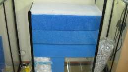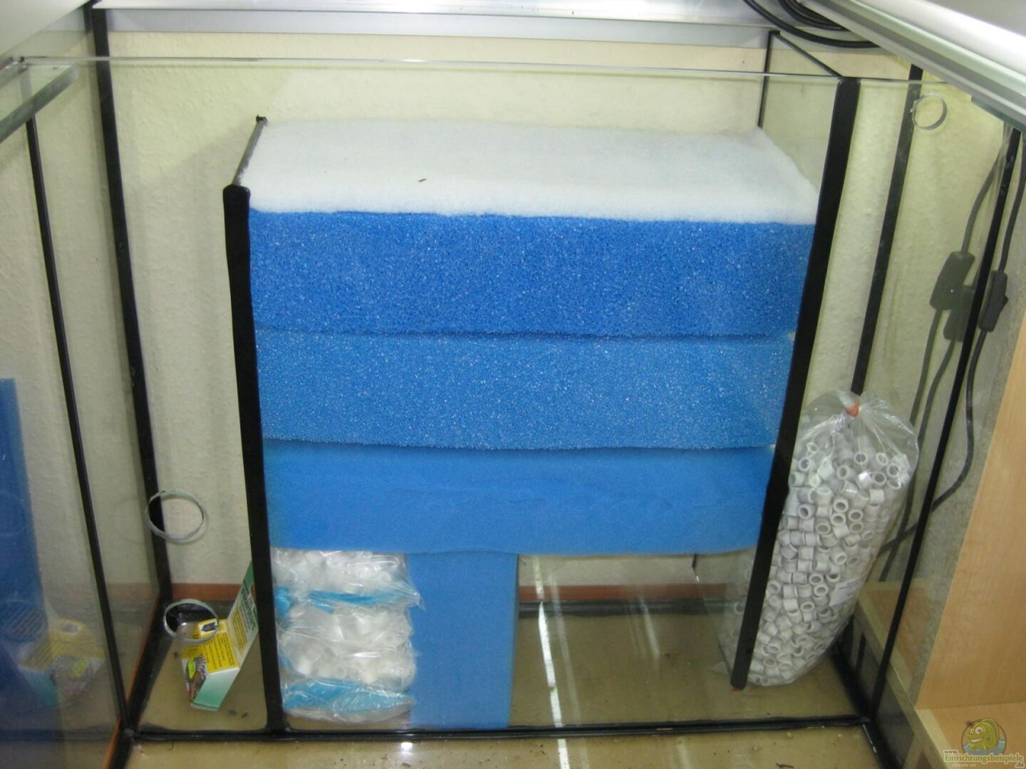 Wegen der gro??en Filterfläche ist die Durchlaufgeschwindigkeit recht langsam, was den Biofilter fördern soll. Im Filter befinden sich hauptsächlich Mattenfilter. Oben liegt ein Flie?? auf, auf dem sich der grobe Dreck absetzt, und das ca. alle 14-30 Tage gewechselt werden muss. Darunter folgen insges. 30cm Filtermatten von grob nach fein. Ganz unten sind Siporax-Rollen, um hier noch ein anaerobes, extrem langsam flie??endes Milieu für Nitrat-Bakterien zu schaffen (gemessen habe ich die Filtereffekte noch nicht). In der letzten Kammer liegen noch mehrere Kilo Zeolith, die ca. 1x im Jahr ausgetauscht bzw. aufbereitet werden. Ansonsten läuft der Filter seit Ende 2010 ungereinigt.