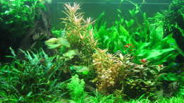 2014-03-14: aktuelle Fotos. Neue Pflanzenarten eingesetzt, Rotanteil deutlich ausgebaut. Technik: nach 3 Jahren wurden nach Verstopfung die Filtermatten zeitversetzt ausgewaschen. Derzeitig ein Problem: eine Undichtigkeit im CO2-System, dadurch war alle 2 Monate die Flasche leer. Fehler wird noch gesucht, Becken derzeit ohne CO2-Zufuhr.