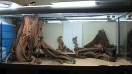 Das Becken ist 20cm vor die helle Zimmerwand gesetzt (Fotos im Kapitel "Technik"), in den Zwischenraum habe ich den Sand und Wurzeln so eingelegt, dass das Becken optisch tiefer wirkt. Von einer geplanten Fotorückwand habe ich Abstand genommen - auf Originalbildern von Amazonasflüssen ist gut sichtbar, dass sich der Hintergrund meist in einer unbestimmten grünlichen Farbe verliert, und genauso sieht es auch im Becken aus. Die Szene im Becken ist also: 2 Bäume stehen im Wasser im überfluteten Sumpfgebiet des Amazonas.