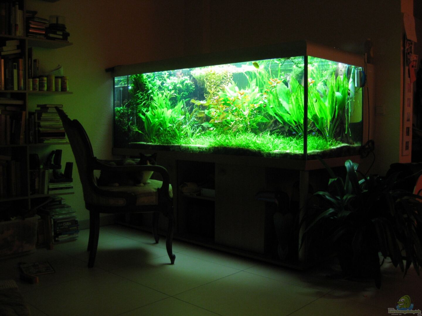 Heute würde ich gern per Aquariencomputer stufenlos die Beleuchtung natürlicher regeln, und z.B. auch gern diverse Düngepumpen etc. anschlie??en, aber die gesamte Technik war mir seinerzeit zu aufwändig und teuer. Vielleicht ist auch die LED-Technik eine Option. Der Stromverbrauch der Beleuchtung ist der grö??te laufende Kostenfaktor des Beckens mit ca. 1 ???/Tag, dafür heizt das Becken die gesamte Etage mit (Becken 26-27°, Wohnung ca. 23°).