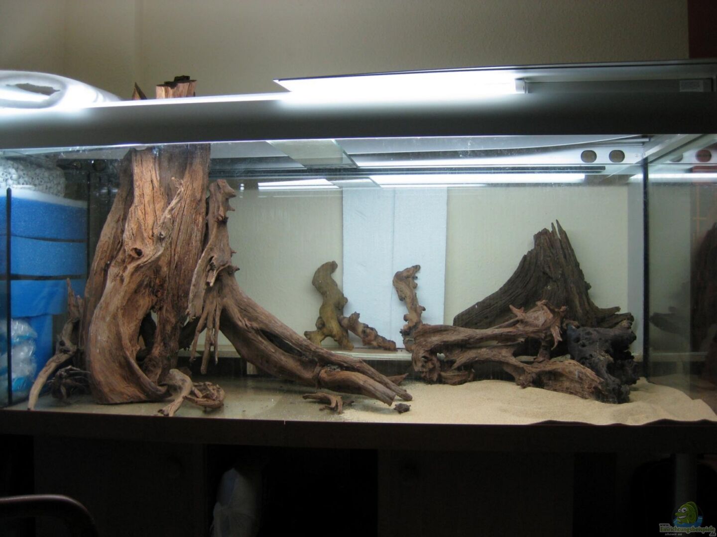 Zunächst war ein zumindest Kontinent-spezifisches Aquarium geplant à la Asien oder Südamerika, aber es war schnell klar, dass ein buntes Gesellschaftsaquarium mit maximalem Pflanzenbesatz aus aller Welt mehr meinem Geschmack entsprach. Ich wollte nicht auf schöne Pflanzen verzichten, nur weil sie von einem anderen Kontinent stammen. Ein wirklich artgerechtes, naturnahes Becken besteht eigentlich nur aus Matsch, Steinen und Altholz, und kaum Pflanzen, wie in 98% der Flüsse der Fall. Au??erdem mussten in meinem Fall unbedingt die Königschichliden rein (Purpur-Prachtbarsche), da ich diese Fische und ihr intensives Revier-, Paarungs- und Aufzuchtverhalten schon seit meiner Jugend liebe - da war dann auch Afrika dabei.