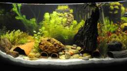 Woche 11 Super klares Wasser, angenehm frischer Geruch, kaum Mulm-Vermehrung, aber etwas Grünalgen sind da. Türkise Algen in der Sandzone. Habe CO2 um 10% reduziert und achte auf knappe Fütterung.