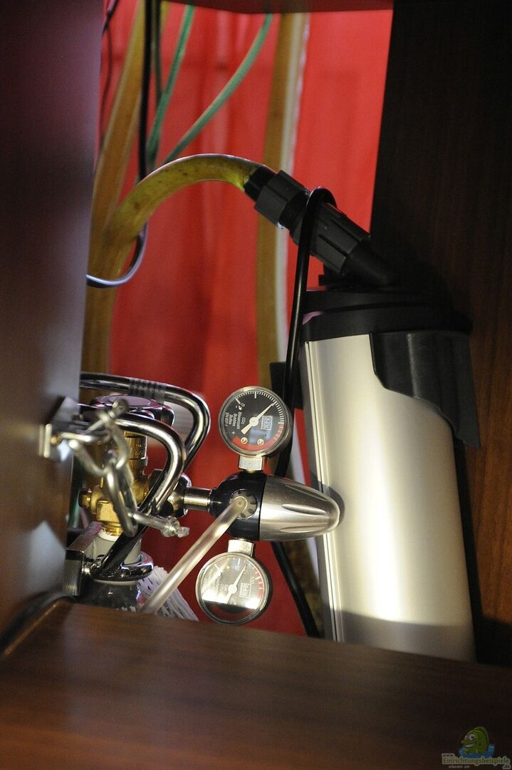 Der erste Kreislauf, ursprünglich am HMF, saugt jetzt über den Korb ab und klärt das Wasser nach wie vor mit UV-C Licht, filtert mit Torf und Watte und reichert es mit CO2 an.