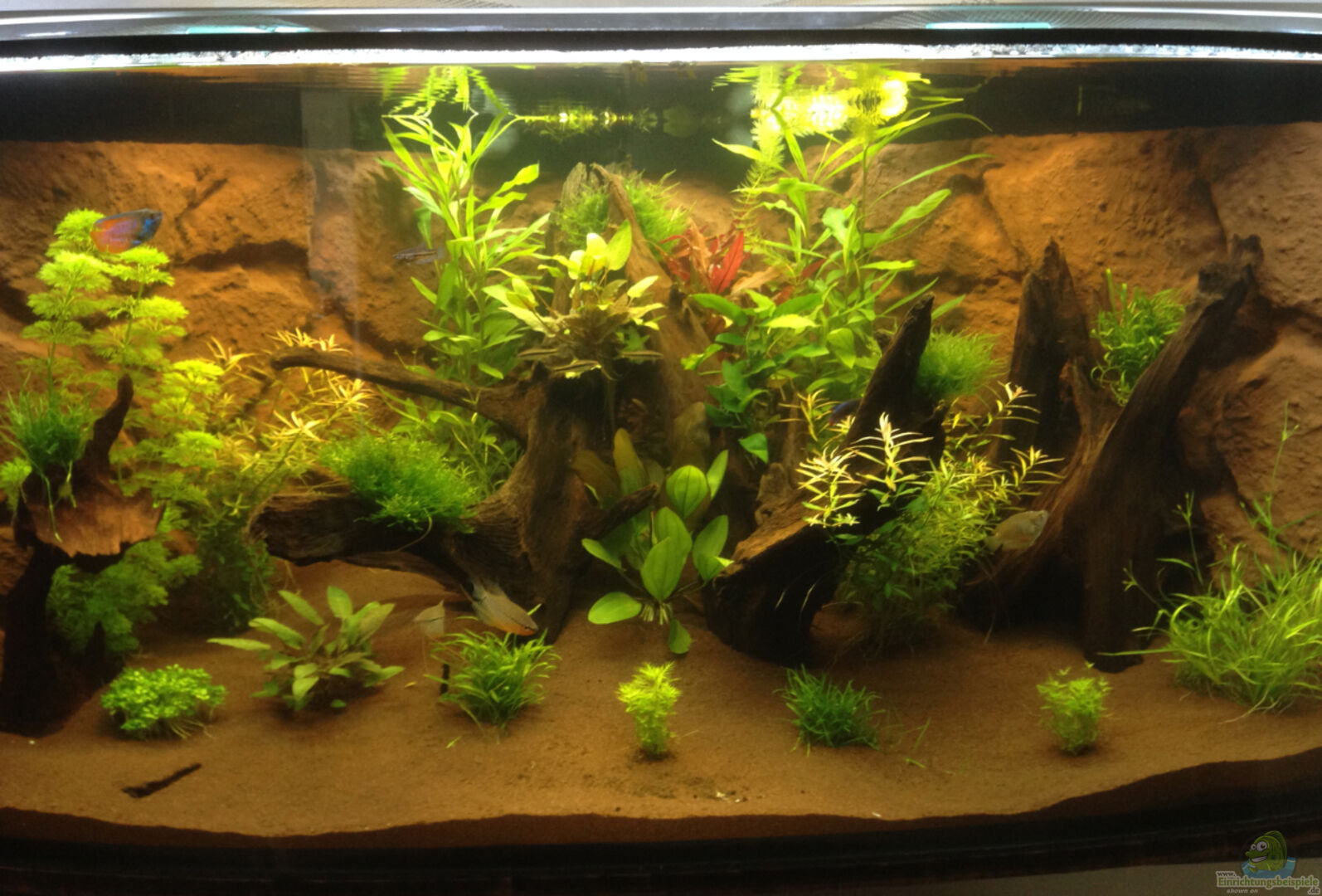 Leider ist das Aquarium insgesamt etwas sehr Braun geworden. Ich hätte doch lieber schwarzen Sand verwenden sollen. Allerdings breiten sich die Pflanzen im Vordergrund schon sehr in der Breite aus, sodass wahrscheinlich in absehbarer Zeit nicht mehr viel von Bodengrund zu sehen sein wird.