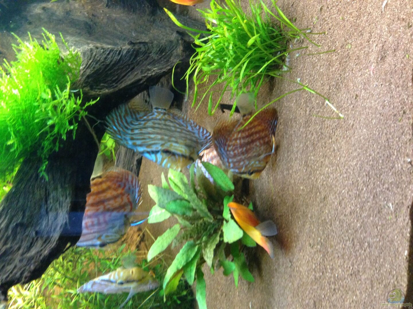 Es hat sich einiges getan. Ein Kampffisch, und das Pärchen Zwergfadenfische sind umgezogen. Dafür sind 8 Diskus eingezogen. Die tummeln sich nun seit fast 8 Wochen und machen sich bisher sehr gut. Die Wassertemperatur wurde vorher langsam angepasst.