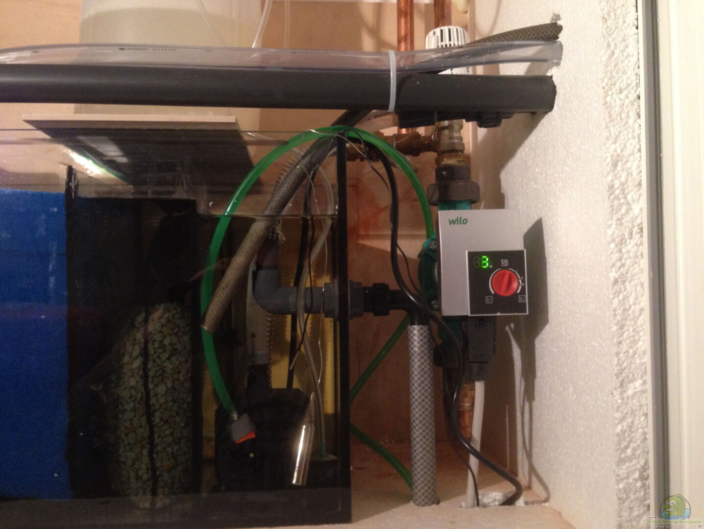 Das Aquarium wird über die Heizung des Hauses auf Temperatur gebracht. Da sich das Technikbecken im Heizungsraum befindet, hat sich diese Variante förmlich aufgezwungen. Für das Technikbecken wurde eine extra Heizungspumpe installiert, da die Pumpe der Hausheizung nicht immer in Betrieb ist. Im Technikbecken ist ein kleiner Wärmetauscher aus Edelstahl untergebracht der nach Bedarf mittels Heizungsthermostat mit Heizwasser versorgt wird. Der externe Fühler des Thermostats ist in der Klarwasserkammer versenkt. Zur Sicherheit wurde der Heizungspumpe noch eine elektrischer Thermostat vorgeschaltet um bei einem Ausfall des Heizungsthermostates ein ??berhitzen des Beckens zu verhindern. Bedes funktioniert wunderbar.