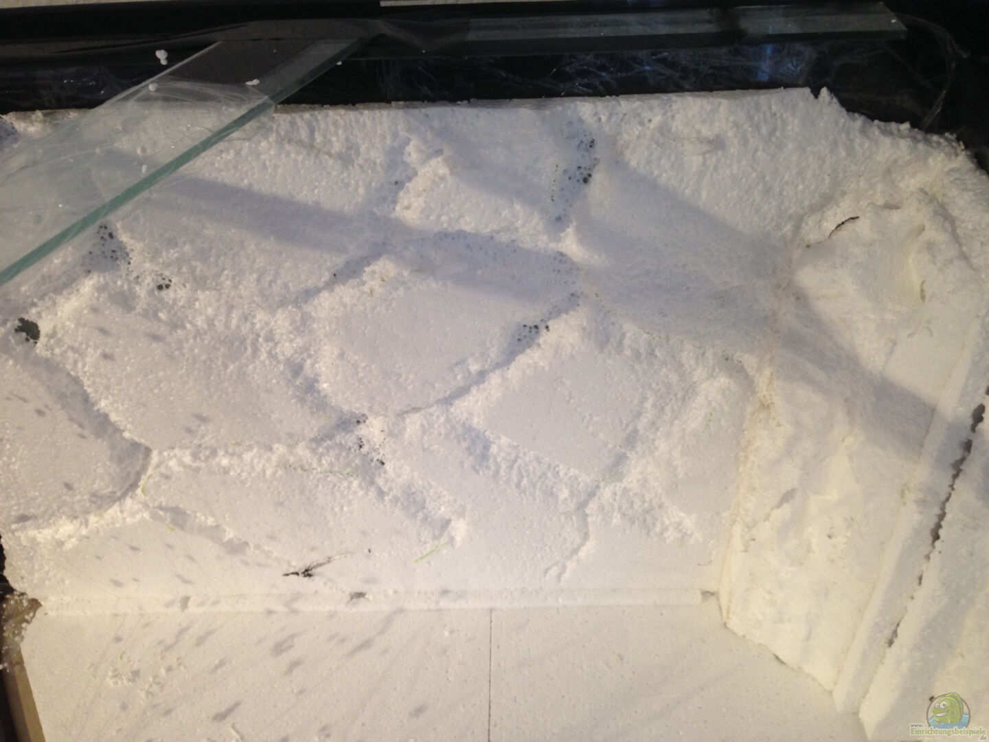 Der Aufbau ging relativ schnell. Zwischen Becken und Siebdruckplatte kam noch eine Sicherheitsunterlage. Von Styropor würde ich in diesem Fall abraten, da er zwar kleine Punktuelle Unebenheiten ausgleichen kann, aber auf die Fläche gesehen ziemlich unflexibel ist. Eine eventuelle Durchbiegung würde so direkt auf die Bodenscheibe übertragen werden. Mosgummi kann das wunderbar ausgleichen.