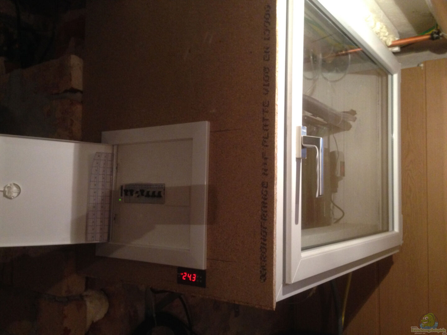 Um im Winter unnötige Wärmeverluste des Technikbeckens zu vermeiden, ist es schön in Styropor eingepackt. Wie ich das ganze auf der Vorderseite verschlie??e war bei Baubeginn noch nicht ganz klar. Bei einem Besuch im Baumarkt bin ich zufällig an einem herrenlosen Fester vorbeigelaufen, dass wohl raus musste und deshalb sehr preiswert war. Das war die ideale Lösung für das noch offene Problem. Leider ist es etwas zu gro??, weshalb das Bauwerk nicht unbedingt einen Schönheitspreis gewinnt. Allerdings ist das eine sehr praktische Lösung. Ich habe alles im Blick ohne es zu öffnen.