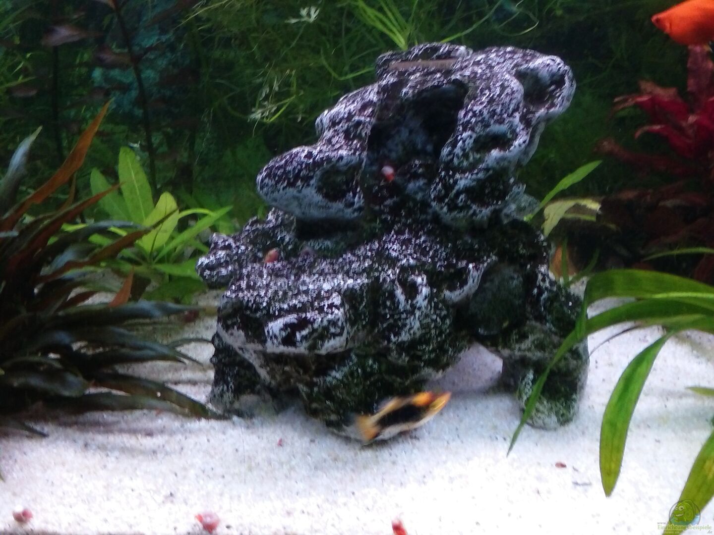 Deko und Höhlen und Verstecke aus cocosnuss und hohle baumstamm und steine aber die Baumstämme sind aus kunststoff....hatte einmal richtiges holz drin aber da wurde das wasser so braun und dunkel