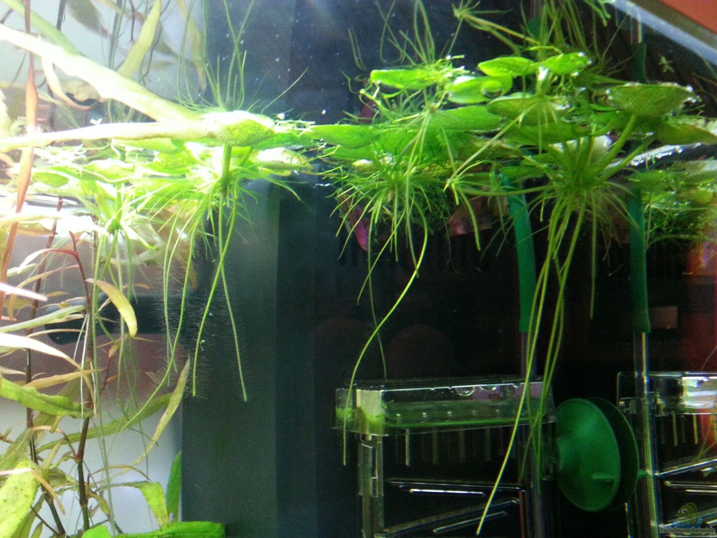 Hintergrund: 3 x Schwarzwurzel, 1 x Ludwigie, 3 x Papageienblatt und in einer Ecke Schwimmpflanzen