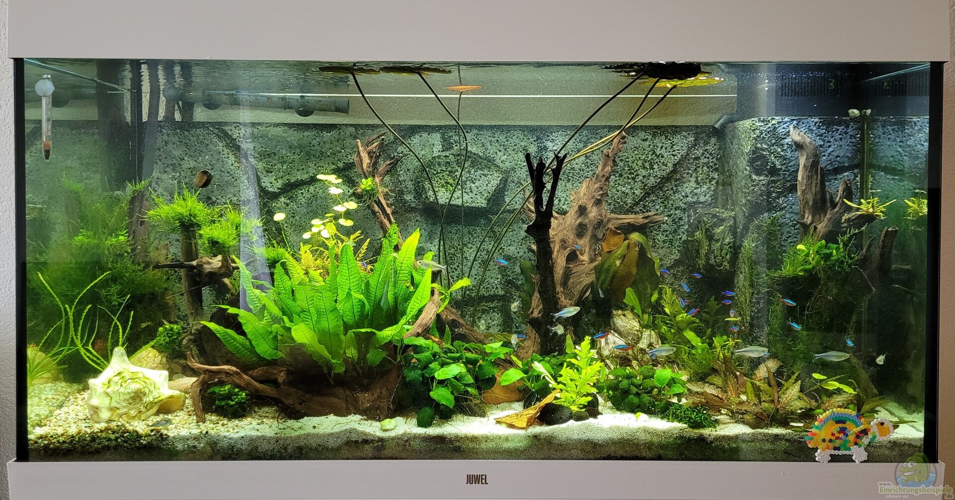 Die Einrichtung könntest du noch etwas optimieren. Super wären sicher noch ein paar Schwimmpflanzen, die das Becken etwas dunkler halten. Das würde einigen deiner Fische wie den Neons entgegenkommen.