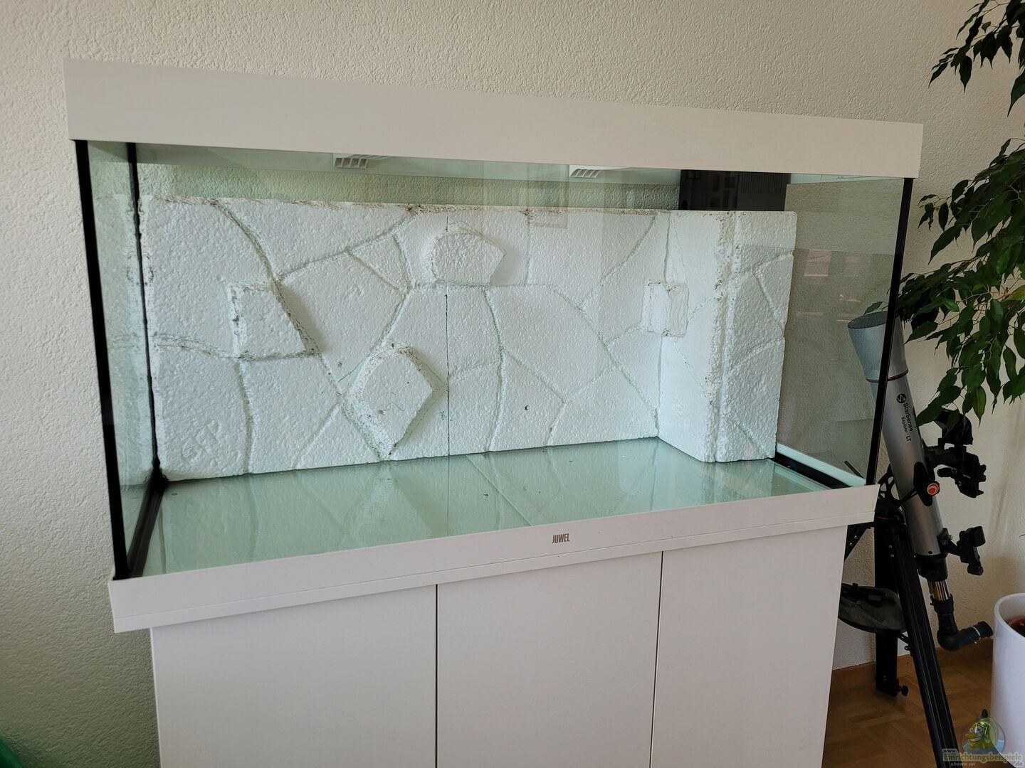 Rückwand habe ich selbst gemacht. Aus Styroporplatten (insgesamt 3) wurde die steinmauer-ähnliche Optik geschlitzt, dann mit heissluftbläser abgerundet und gesteichen. Schließlich mit Harz versiegelt.