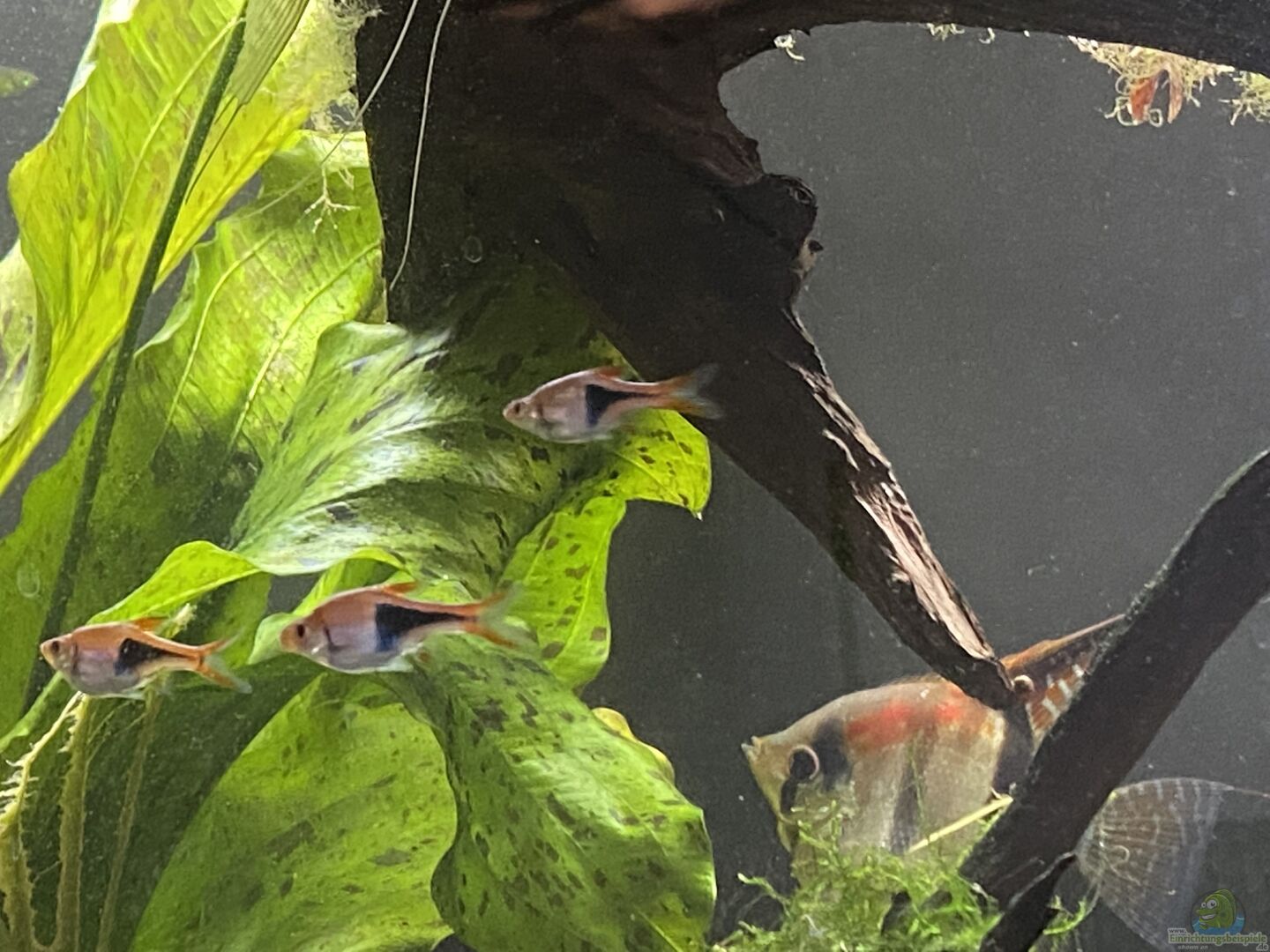 - 6 x Smaragd-Rasbora, Microdevario Kubotai - die sollten hier eigentlich gar nicht rein, sind aber durch einen Fehler beim Umsetzen aus dem alten kleineren Becken hier gelandet. Es sind extrem flinke, aktive Kerlchen, die ich nicht mehr rausfangen kann. Obwohl sie so klein sind, sollten diese Fische wirklich Platz haben, sie schwimmen sehr viel und schnell und nutzen das Becken komplett aus