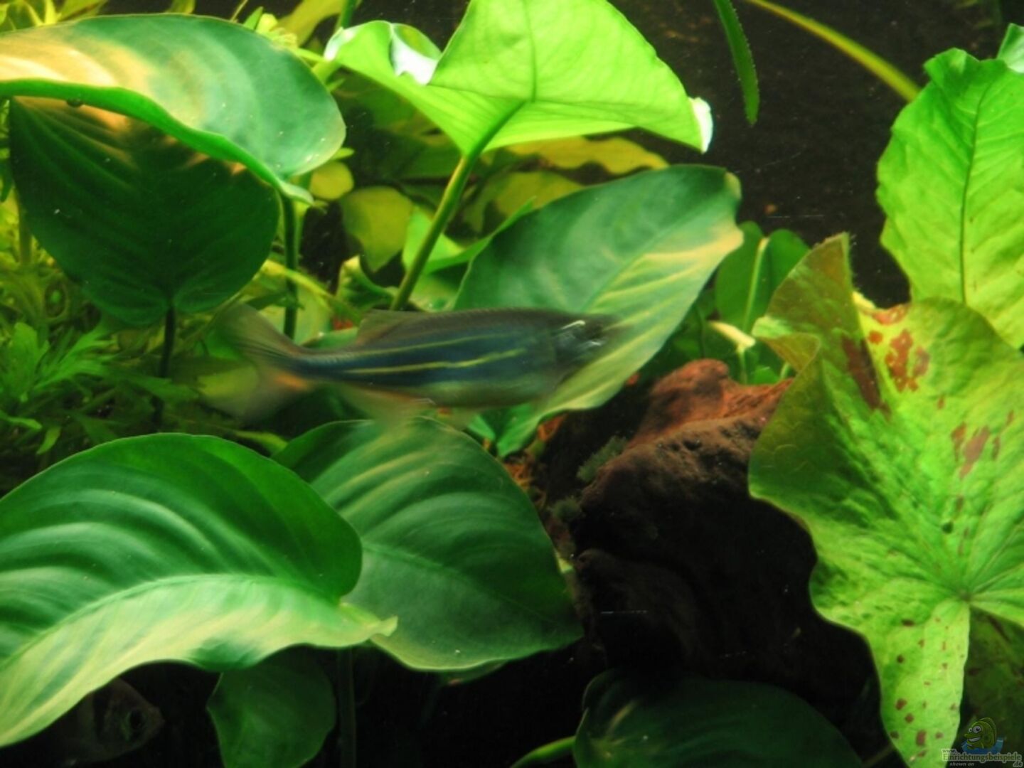 - Anubias barteri var. nana (Zwergspeerblatt, auf Wurzel hinten)