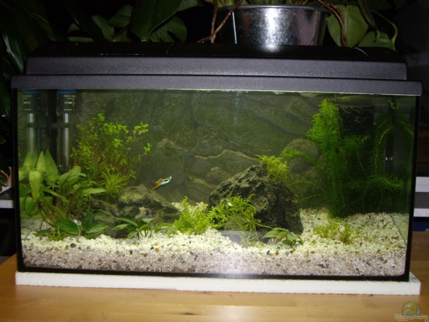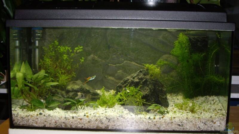 Ich wollte dieses Aquarium schon aufgeben, da hat es mich doch noch mal gepackt, und ich habe hellen Kies reingemacht. Es kamen neue Pflanzen hinzu, die noch anwachsen müssen. Das Münchner Wasser (megahart) mische ich ab sofort 1:1 mit destilliertem Wasser. Au??erdem soll eine Bepflanzung mit kleineren Vordergrundpflanzen und verschiedenen Rotala-Sorten im Hintergrund folgen, auch als Versteck für rangniedrige Fische. Jetzt hoffe ich erstmal, dass das weichere Wasser den Pflänzchen gut tut.