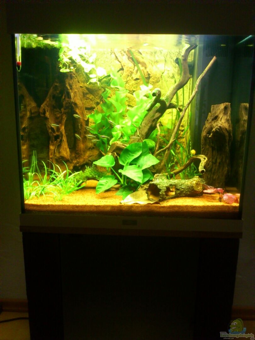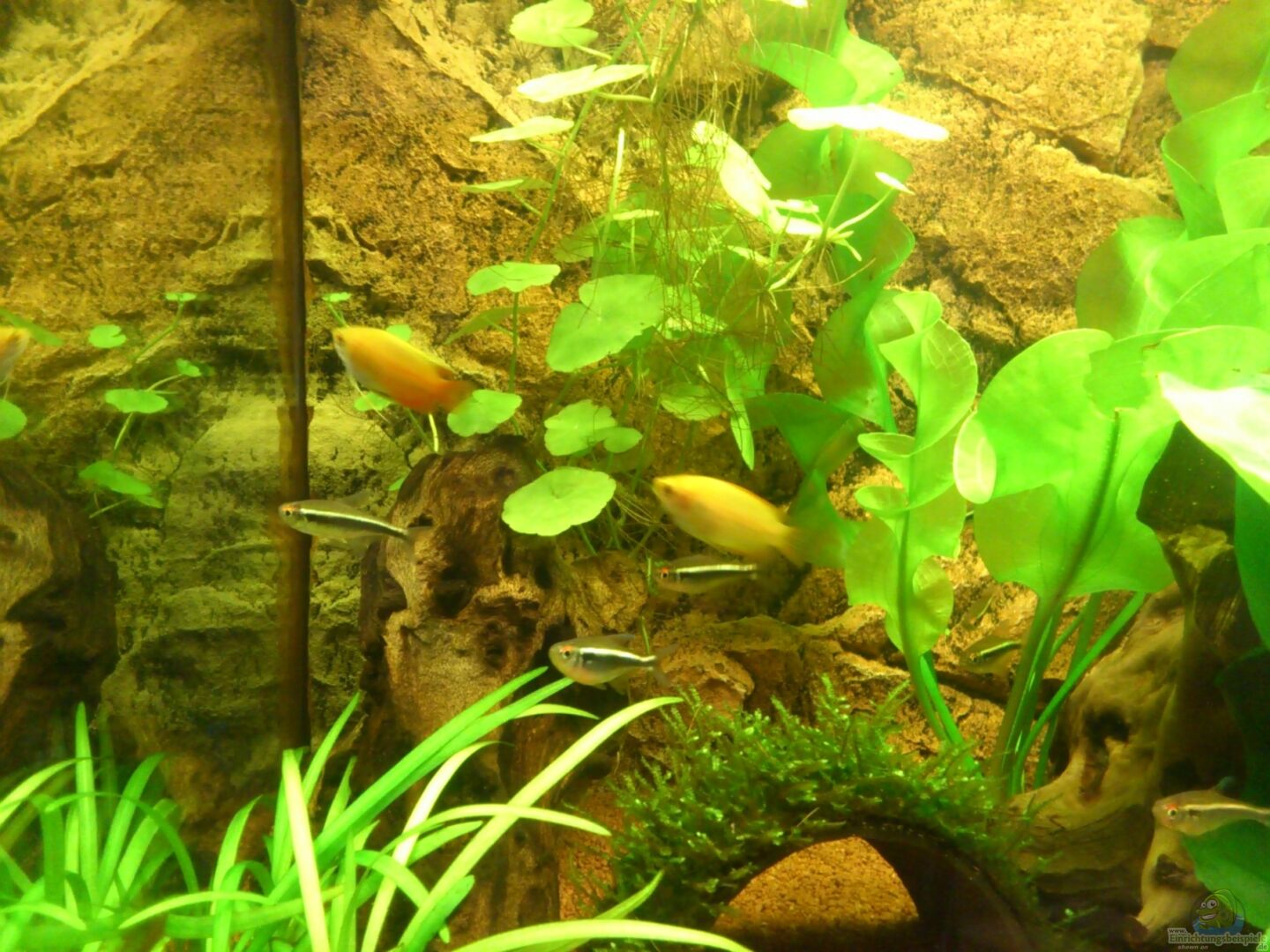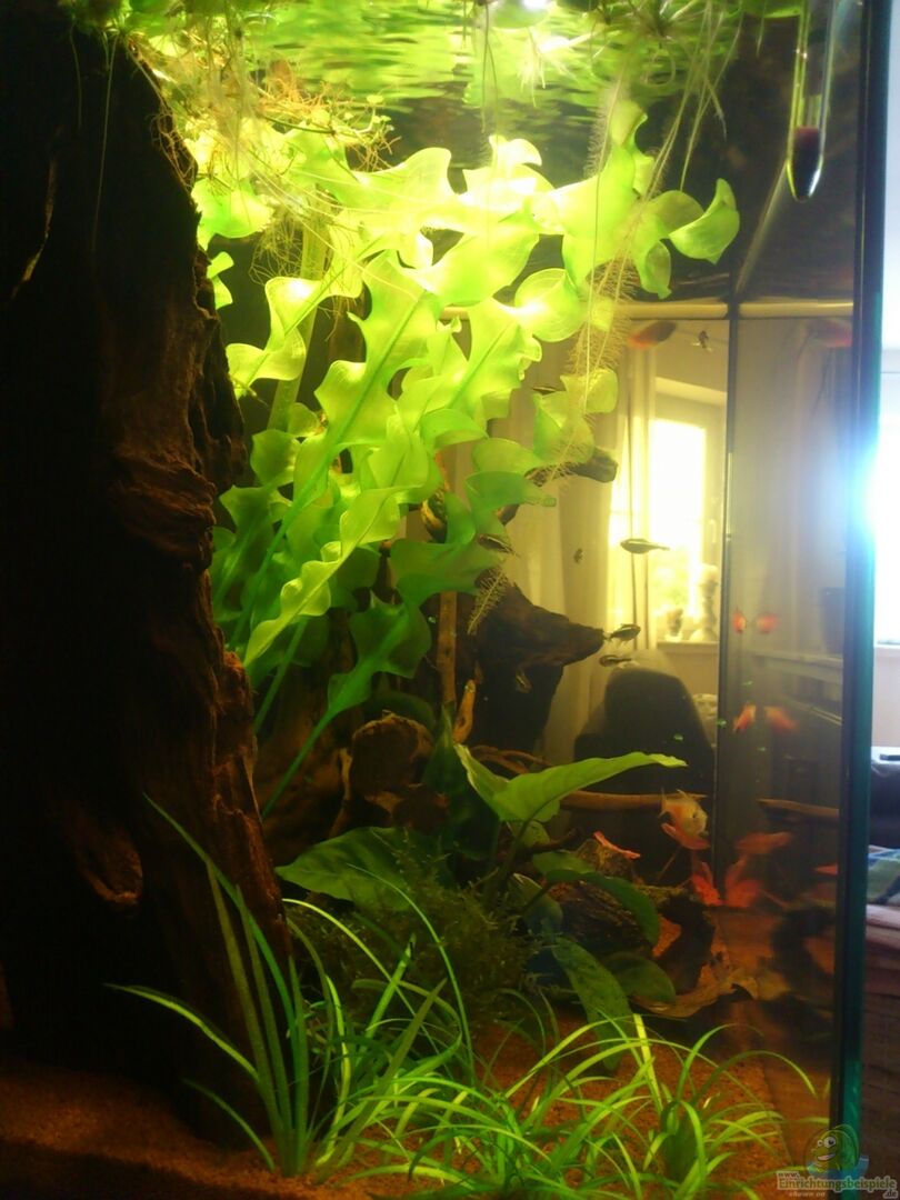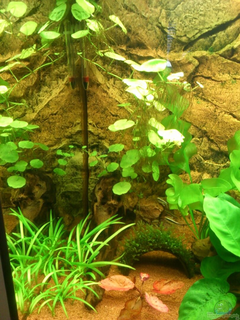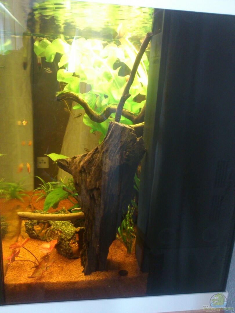 Das Becken wurde ein wenig umgestaltet. In den Ecken sind zwei Mangrovenwurzeln hinzugekommen, dabei wurde für die Honigguramis noch eine Ecke mit Schwimmpflanzen(Froschbiss) geschaffen.