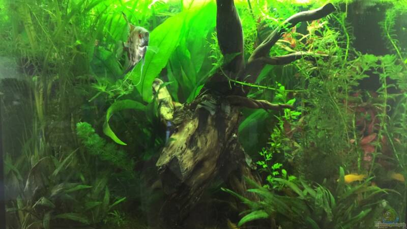 Rechts im Hintergrund ist eine mittlerweile sehr gro??e Echinodorus grisebachii, die seit kurzem auch einige Ableger hat. Die Cryptocoryne ist im Vordergrund angeordnet. Ceratophyllum wird als Schwimmpflanz eingesetzt.