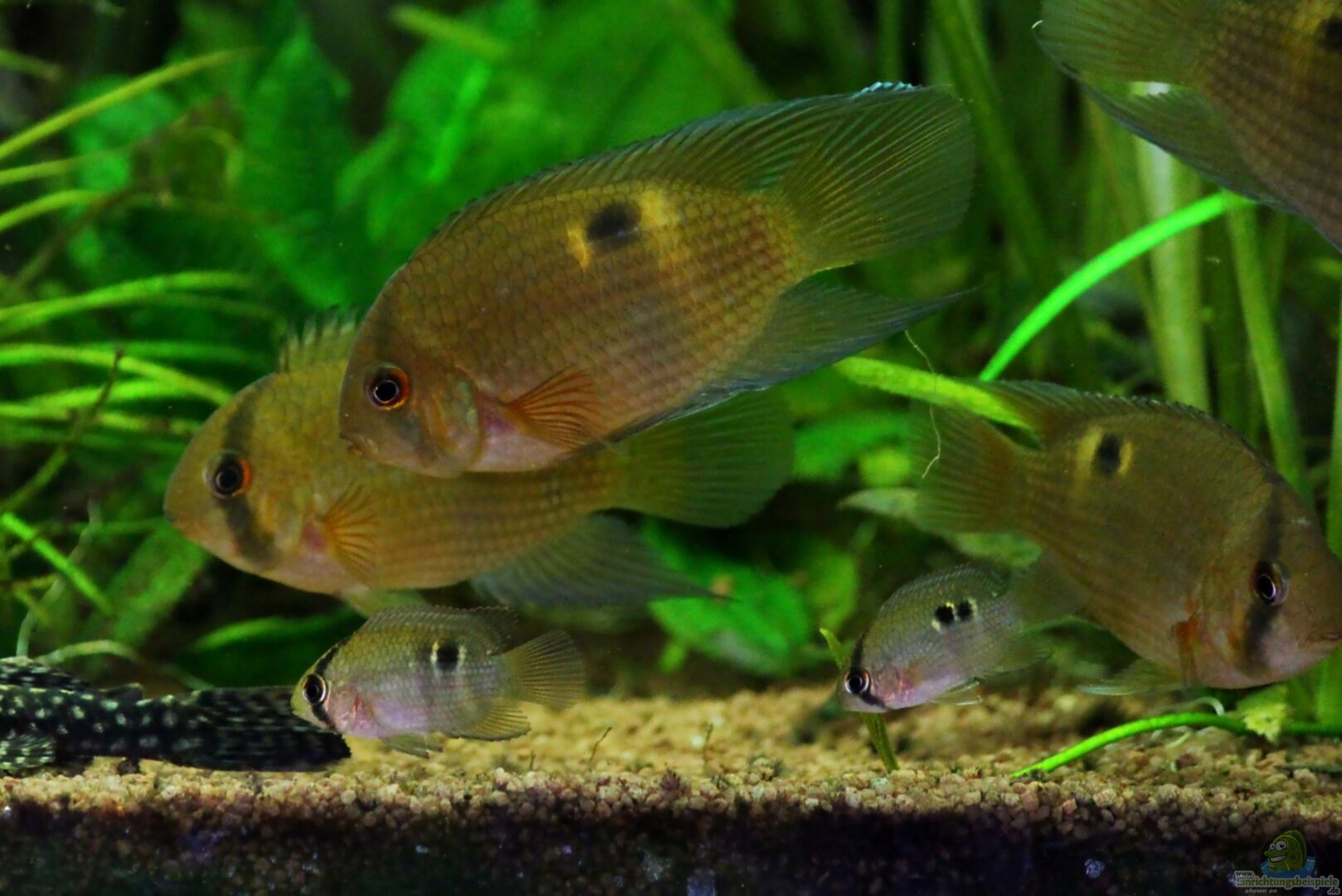 Heute habe ich meine beiden Maroni Jungfische wieder zu den Eltern gesetzt. Sie sind jetzt ca. 2cm gro??. Es gab keine Streitigkeiten und nach kurzer Zeit schwammen schon alle zusammen durch das Becken.
