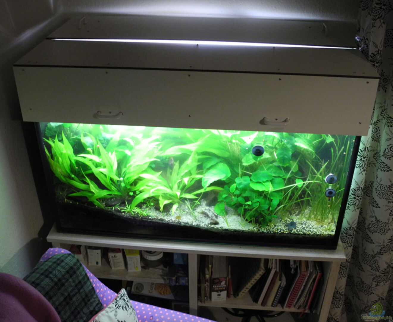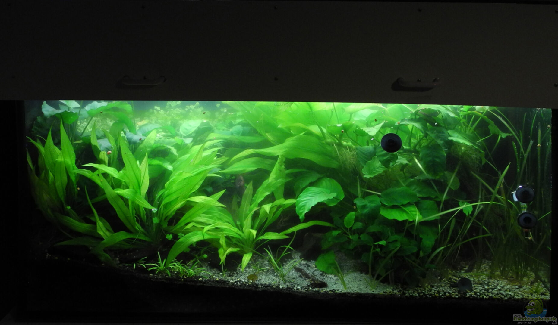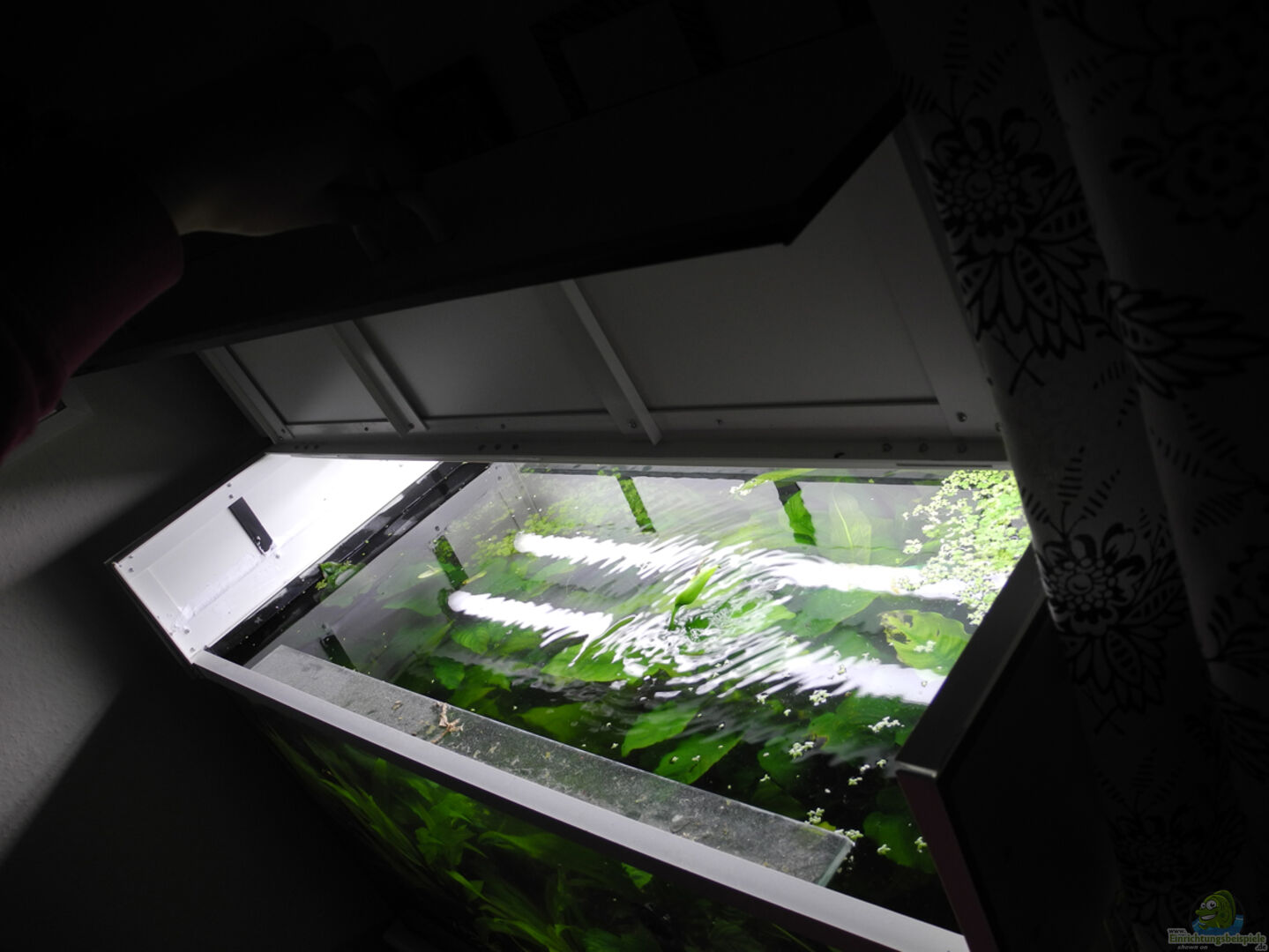 Die Beleuchtungszeit beträgt 12 Stunden. Mittags gibt es eine zweistündige Beleuchtungspause. Da ich Tagsüber oft nicht daheim bin kann so das Licht abends länger an bleiben. Zudem wurde mir diese Mittagspause oft empfohlen, da diese Algenwuchs vorbeugen soll. Bei Aquarien, die nicht in dunklen Ecken stehen kann das vielleicht sogar zutreffen. Bei meinem Becken ist es allerdings eher Gewohnheitssache. Algenprobleme hatte ich aber noch nie.