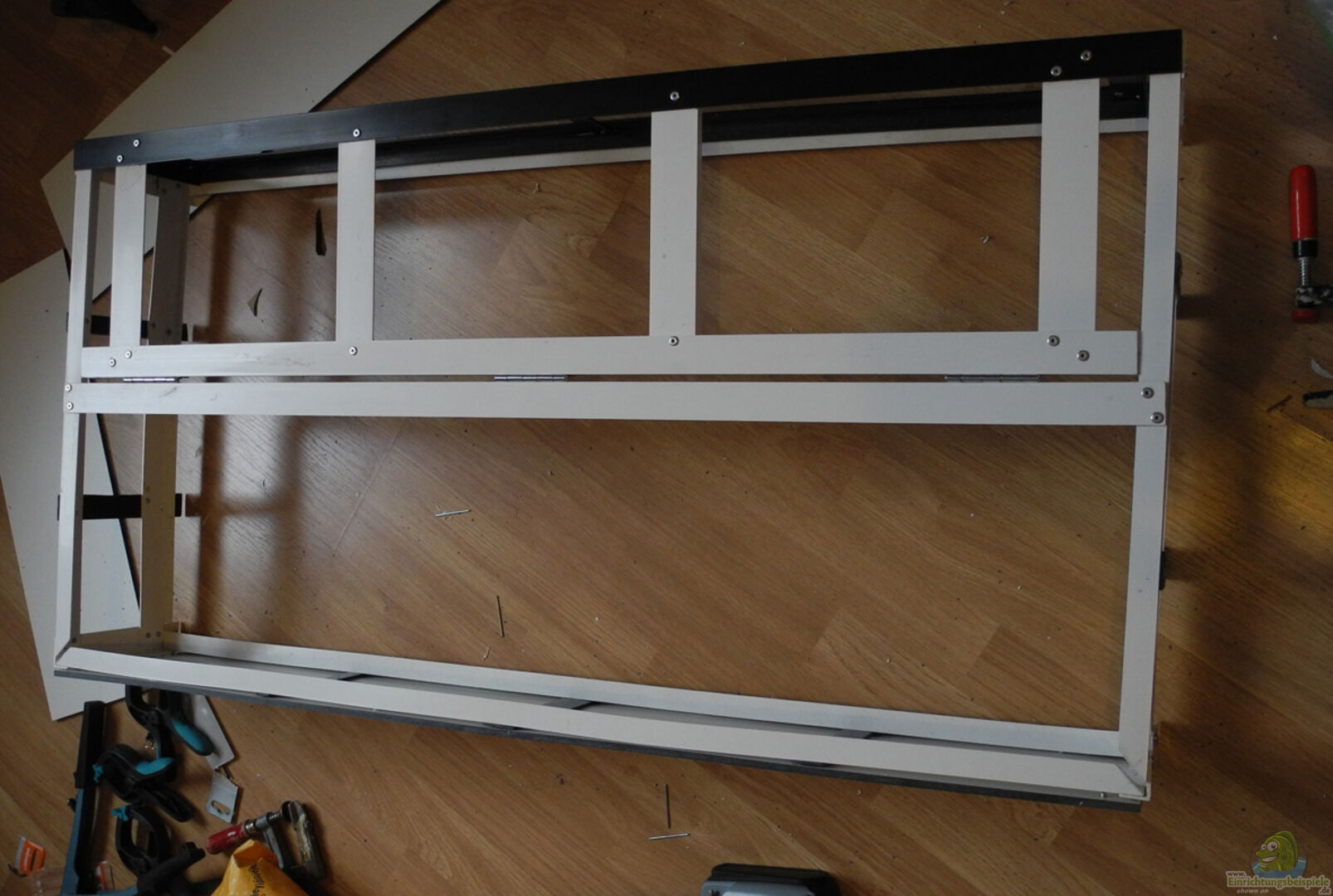 März 2014 - Hilfe! Die Aquarienabdeckung hat innen mächtige schwarze Schimmelflächen abbekommen! Ich habe sie umgehend weggeschmissen, wirklich schade drum. Also schnell eine Konstruktion improvisiert um die Leuchtbalken über dem Becken zu halten und ab in den Baumarkt. Dort hab ich PVC-Leisten geholt und klebe diese heute zu einem Rahmen zusammen. Wenn die Konstruktion die Leuchtbalken halten überlege ich mir wie ich sie verkleide.