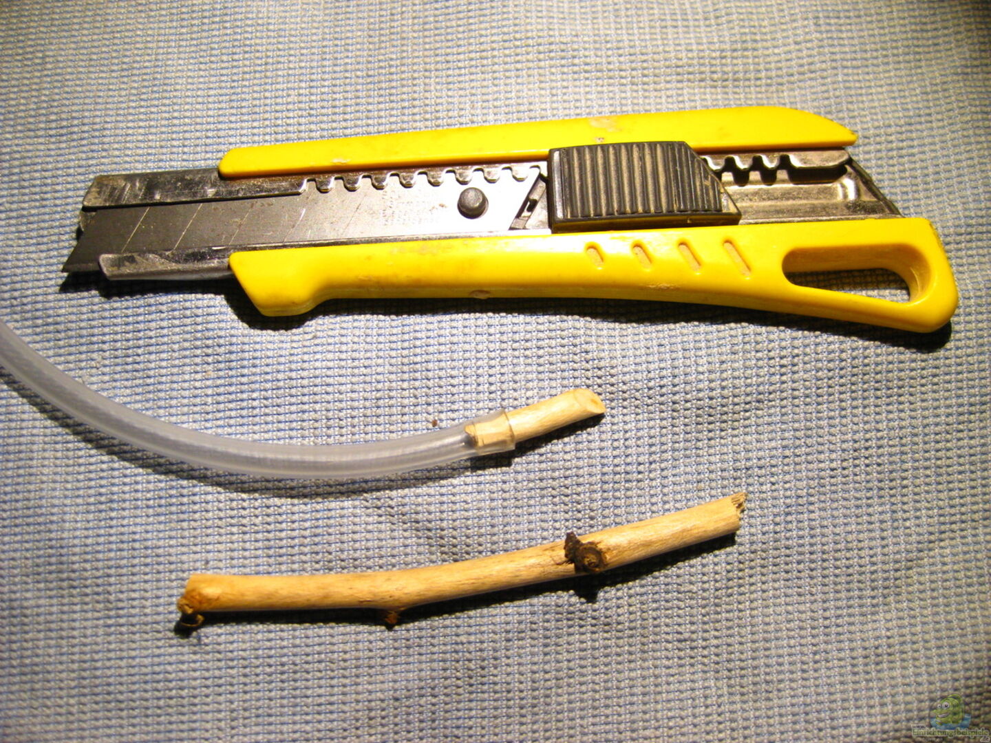 Dafür nehme ich einen dünnen, trockenen Lindenast. Abgestorbene ??ste mit passendem Durchmesser liegen meistens unter Linden herum. Der Ast wird entrindet, etwas angespitzt soda?? er in den Luftschlauch geschoben werden kann und auf 2-3 cm mit dem Cutter-Messer glatt abgeschnitten.