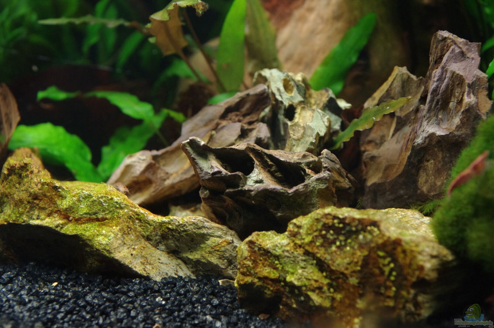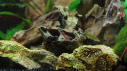 Teichlebermoos aus dem Becken genommen. Java-Moos auf eine weitere Wurzel, auf den Stein und die Tonhöhle gebunden.