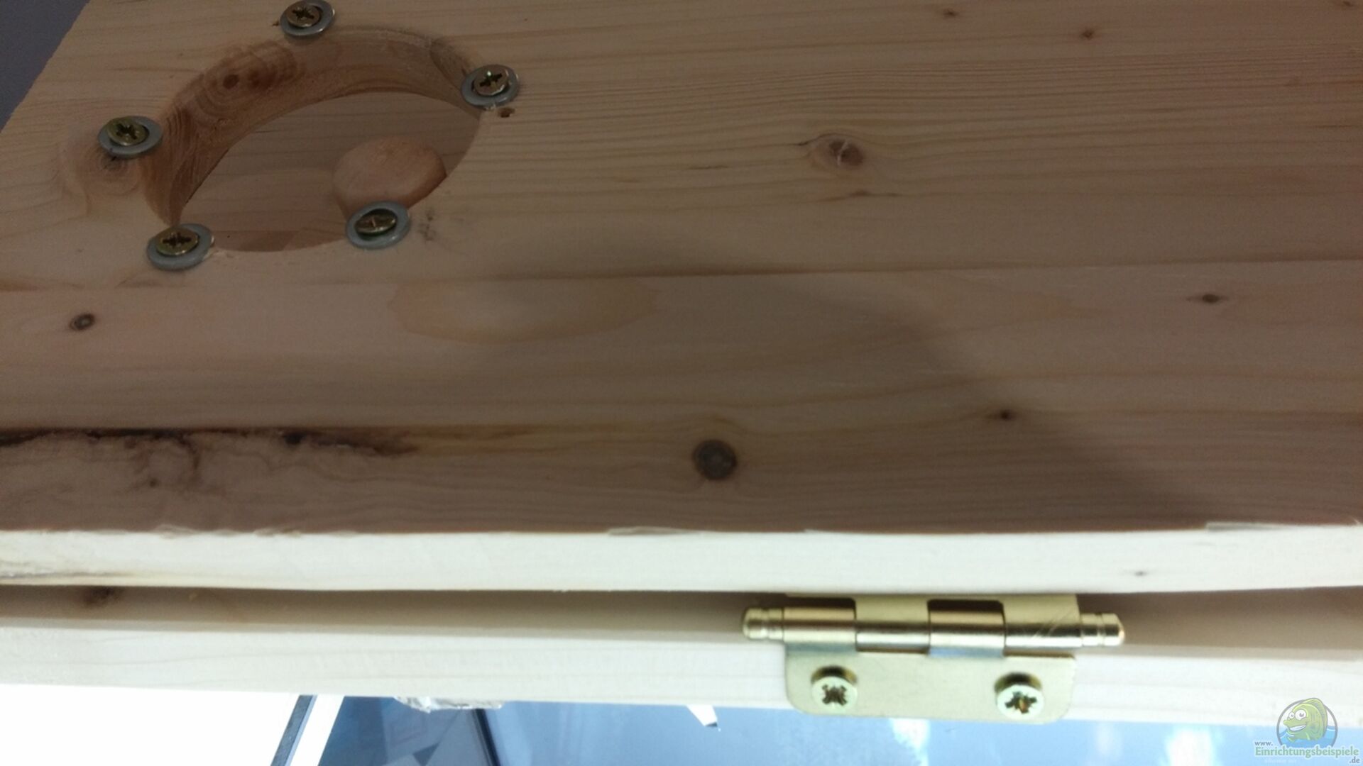Eheim 126l Aquarium. Ohne Längsstreben. Mit schwarzem Silikon. Eine selbst gebastelte Abdeckung aus Vollholz mit Futterluke .