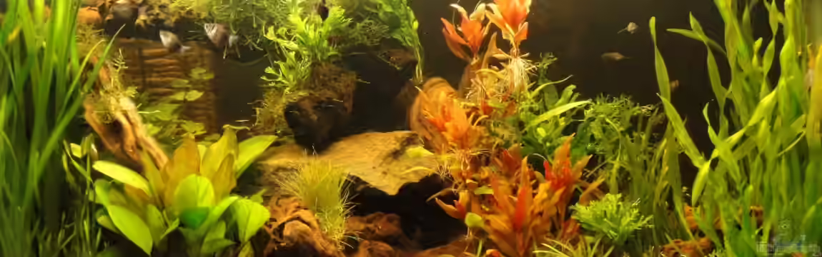 Das Becken steht ohne Unterschrank direkt auf dem Fu??oden (naürlich auf einem dämmendem Unterbau bestehend aus einer 30mm mdf-Platte und 30mm Holzfaserdämmwolle). Das ganze wurde mit Sockelleisten passend zum Dielenboden verkleidet. Das Becken dient als Raumtrenner. Die an der Wand stehende kurze Seite ist schwarz abgeklebt. Die Fische haben durch den groszügigen Wurzelaufbau und die dichte Bepflanzung reichlich Rückzugsmöglichkeiten.