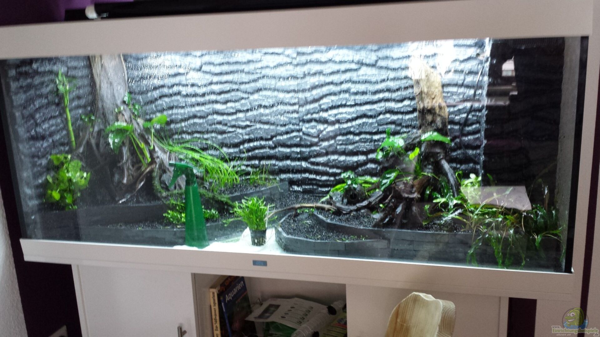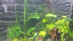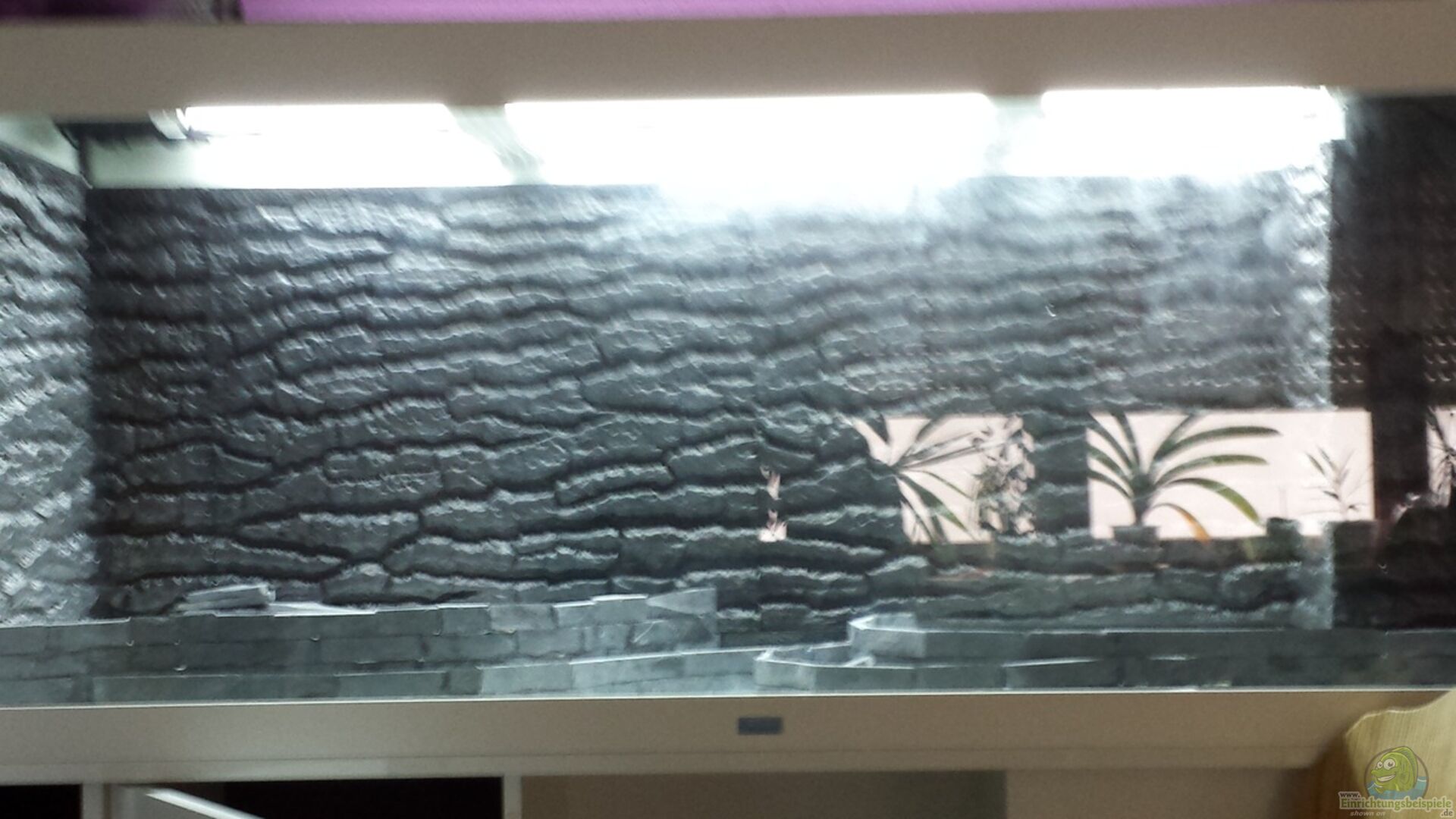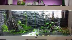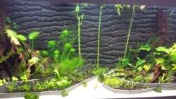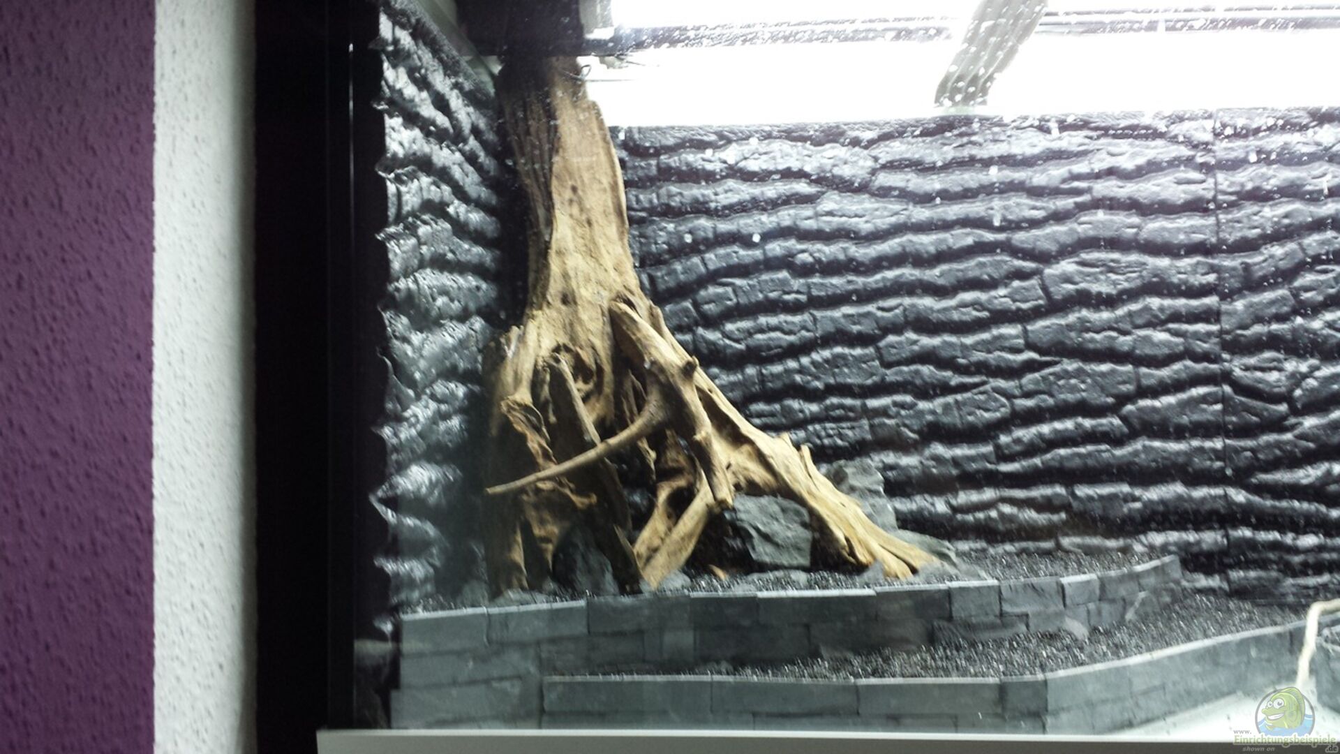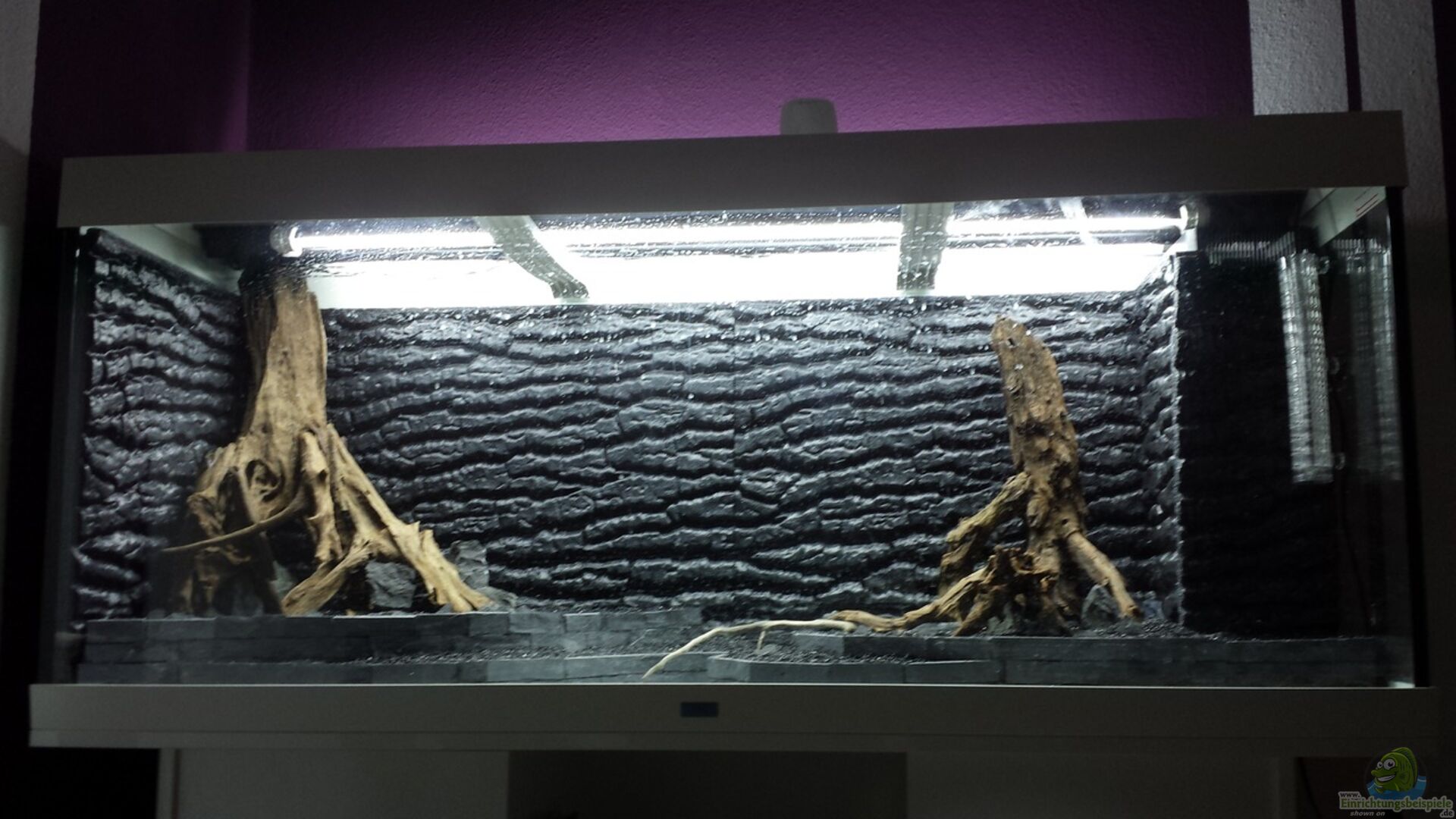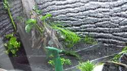 Im Hintergrund wurde eine Rückwand ( Juwel STR 600) eingeklebt. Die Stein Terrassen wurden aus Schwarzen Schiefer Naturstein auf eine Plexiglasplatte mit Silikon geklebt. Musste alle einzeln zurecht schneiden. Die Steine sind auch mit Silikon zusammen geklebt habe aber kleine Löcher gelassen um eine Luftzirkulation im Bodenbereich rein zu bekommen zusätzlich wurden an den au??en Kanten von den Terrassen kleine schwarze Filterschwammstreifen eingeklebt.