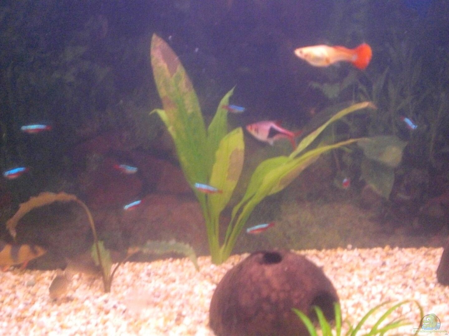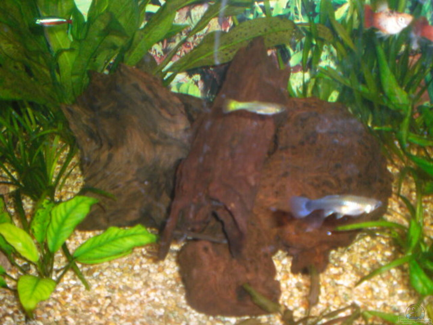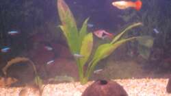 6 Rotkopfsalmler und 8 Guppys dazu gekauft. Hintergrund mit Valisneria bepflanzt. Langsam wird das Becken ansehnlich.