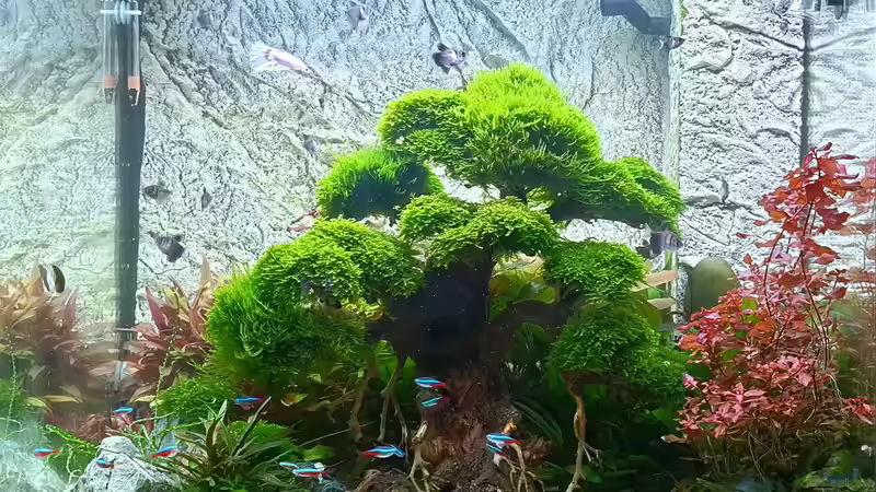 Dieses ist mein erstes Aquarium mit dem ich Ende Dezember 2021 begonnen habe (Mittlerweile sind es 7). Ich habe hier trotz der meisten Empfehlungen auf den goldenen Schnitt bei der Einrichtung verzichtet, da für mich der Bonsai der Zentrale Punkt ist und somit auch seinen Platz dort genie??en darf.