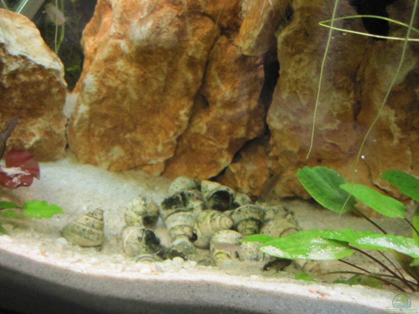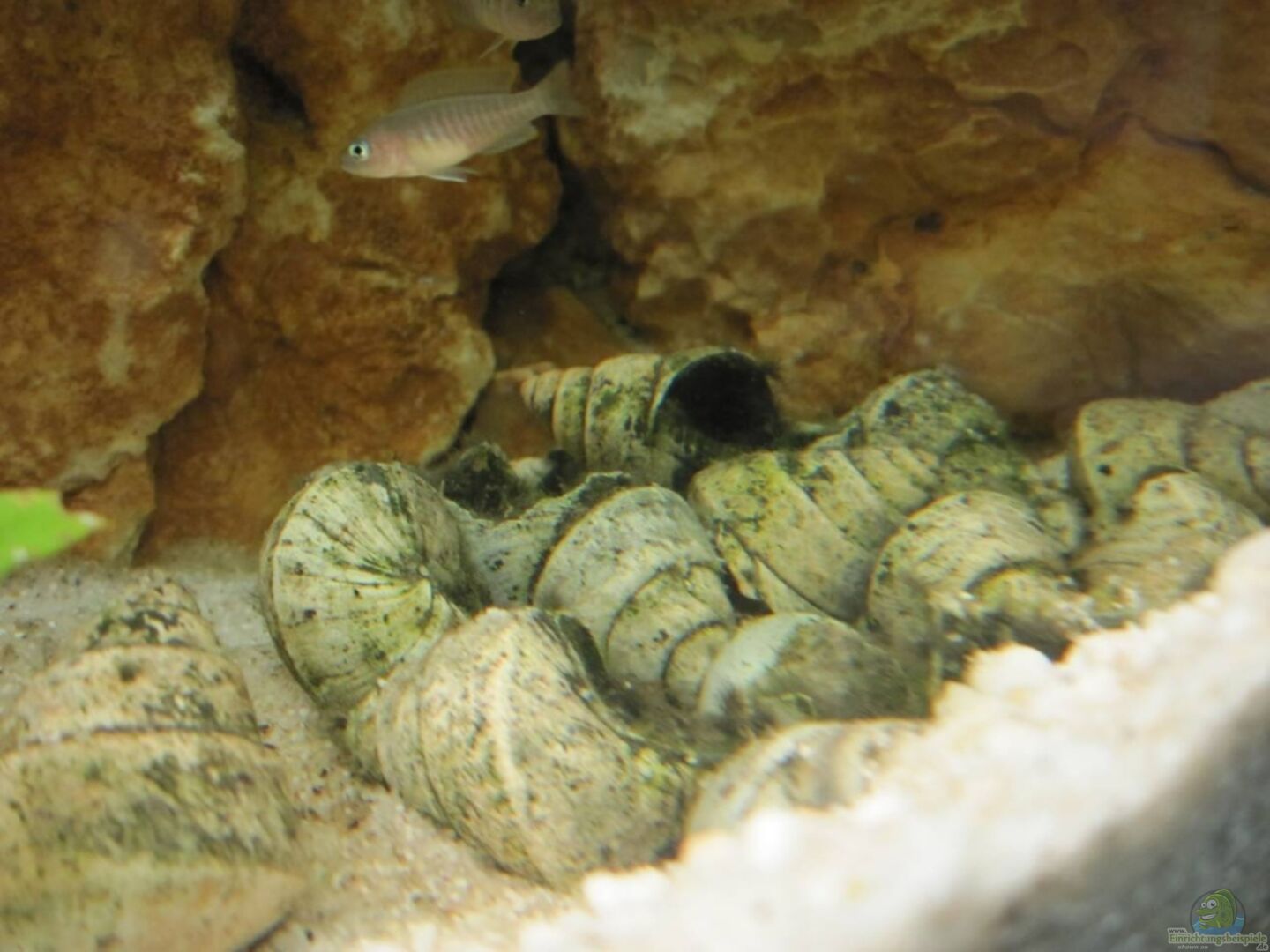 *diverses Kalkgestein aus dem Garten (auf eine 1cm dicke Styroporplatte direkt auf dem Aquarienboden aufgebaut; so können es die Schneckenbuntbarsche nicht untergraben)