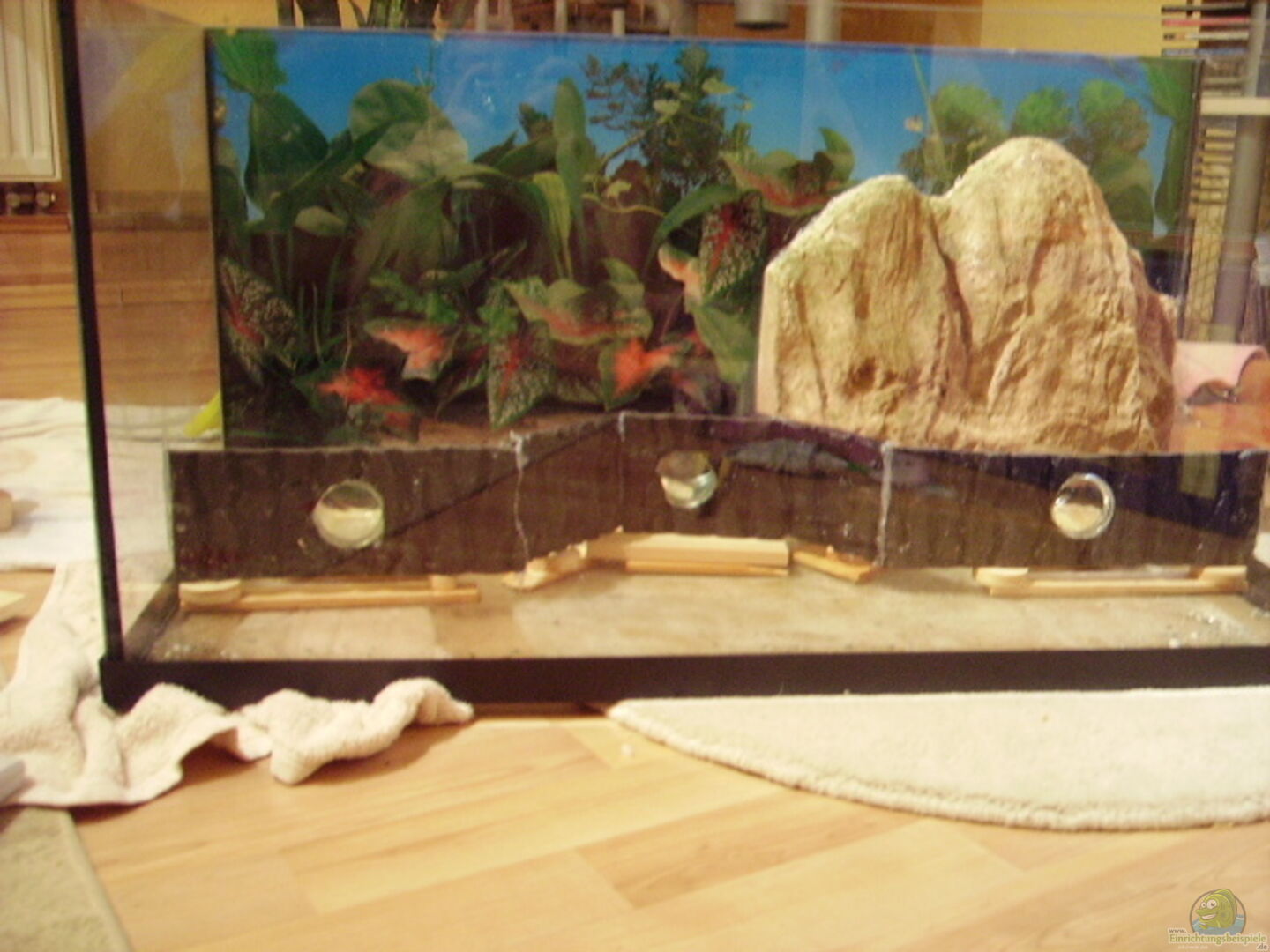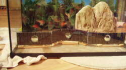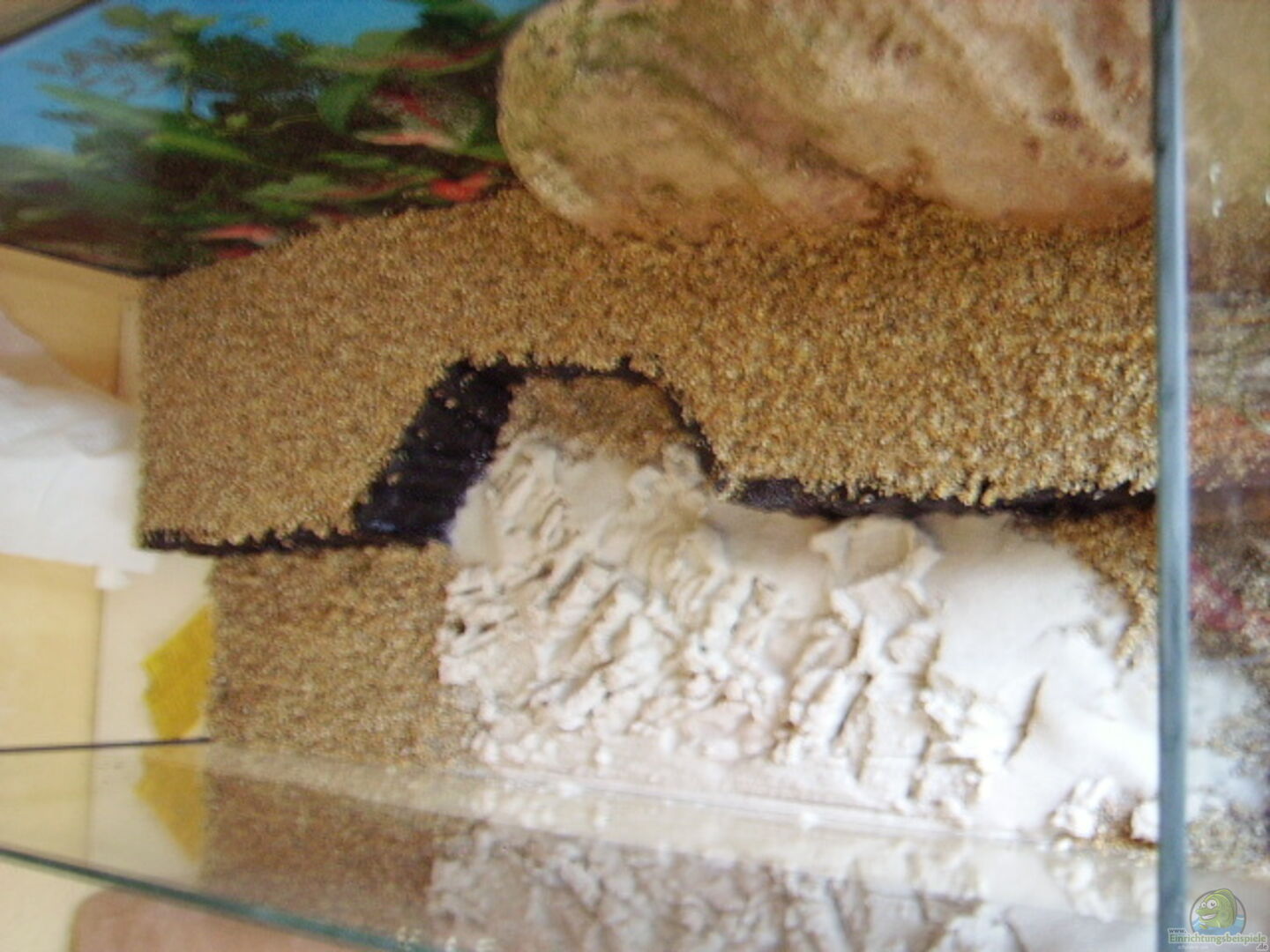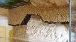 Die Terasse wurde aus einer Aquarium-Rückwand (Juwel Schwarze Riffel) gefertigt wobei hier die Rückwand in ca 7cm Streifen geschnitten wurden und eingepasst wurden innerhalb der Terassen Felder aussparungen für Höhlen gefertigt (siehe weitere Einrichtungen)