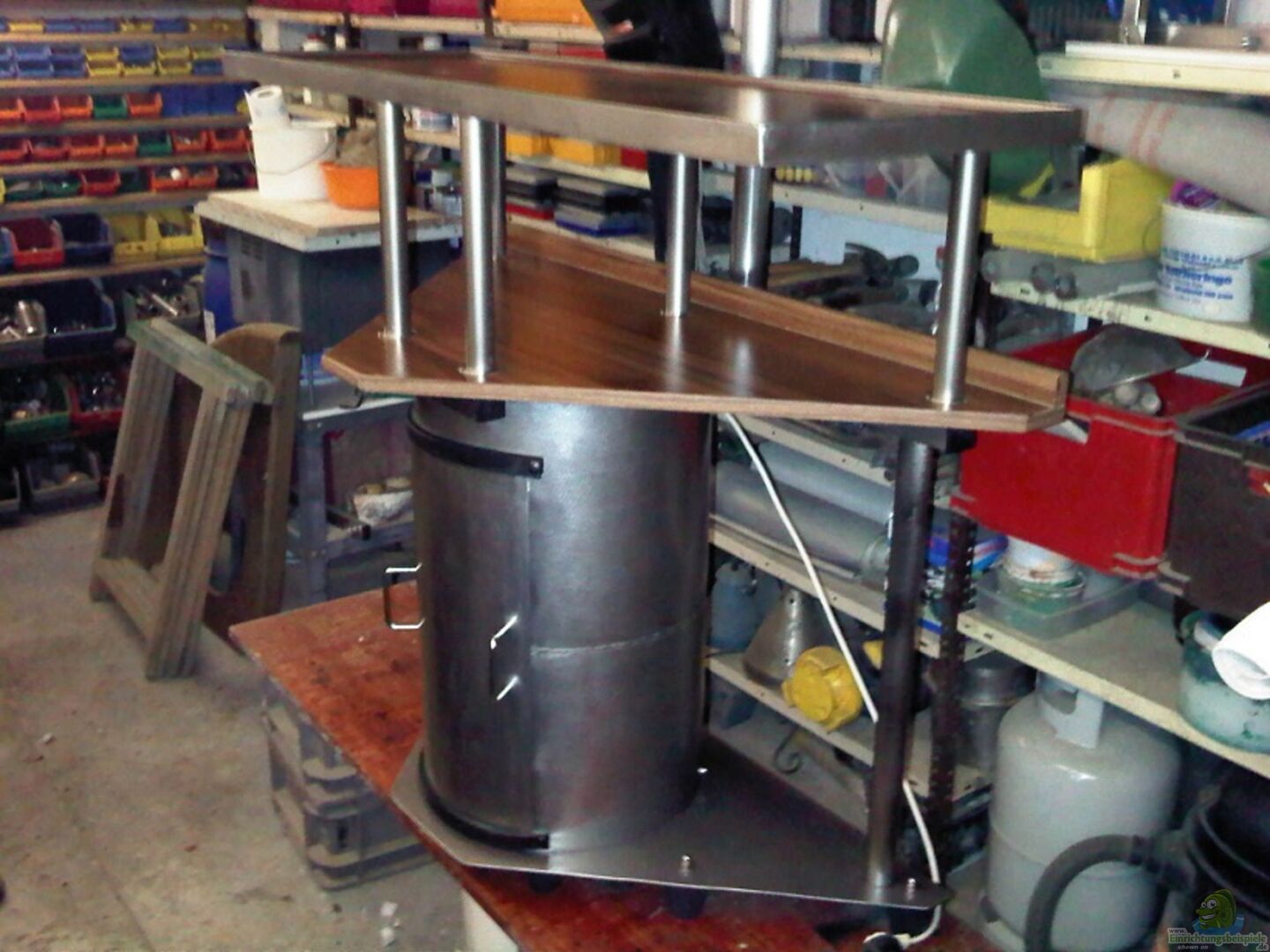 deinen schrank als komplettes würd ich gerne sehen, deine konstruktion sieht wirklich spannend aus, auf dem hauptbild ist leider davon nichts mehr zu sehen, man könnte meinen dein becken stehe mit den stahlbeinen auf dem boden, und der rest hängt wohl bei deinem untermieter von der decke :-)